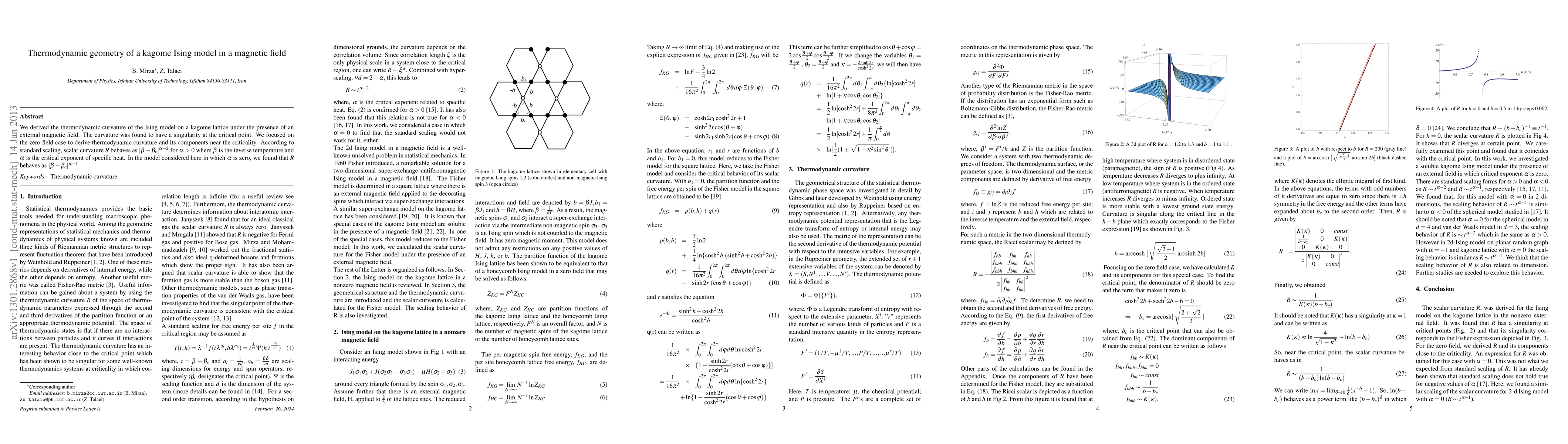 This paper explores the thermodynamic curvature of a kagome Ising model under an external magnetic field, revealing a singularity at the critical point. The study finds that the scalar curvature $R$ scales as $|\beta-\beta_{c}|^{\alpha-1}$ near the criticality, differing from the standard scaling behavior when $\alpha$ is zero.