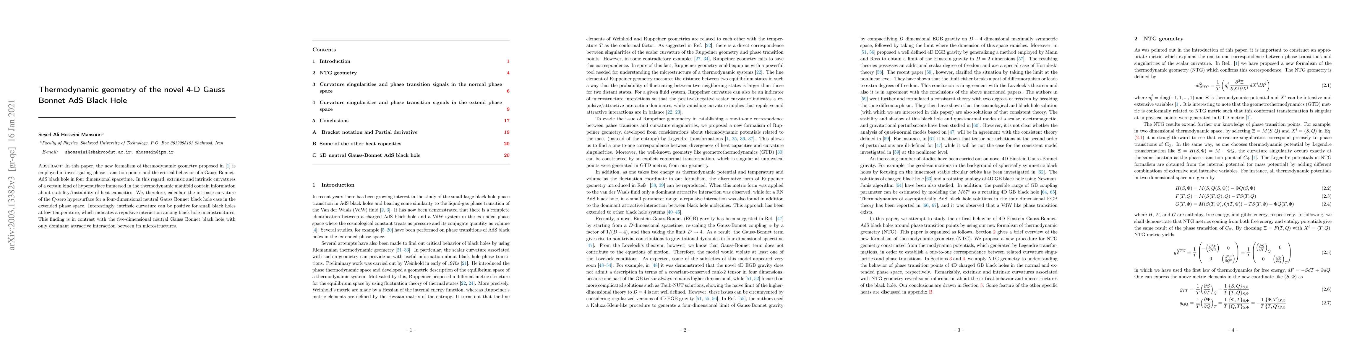In this paper, the new formalism of thermodynamic geometry proposed in [1] is employed in investigating phase transition points and the critical behavior of a Gauss Bonnet-AdS black hole in four dimensional spacetime. In this regard, extrinsic and intrinsic curvatures of a certain kind of hypersurface immersed in the thermodynamic manifold contain information about stability/instability of heat capacities. We, therefore, calculate the intrinsic curvature of the $Q$-zero hypersurface for a four-dimensional neutral Gauss Bonnet black hole case in the extended phase space. Interestingly, intrinsic curvature can be positive for small black holes at low temperature, which indicates a repulsive interaction among black hole microstructures. This finding is in contrast with the five-dimensional neutral Gauss Bonnet black hole with only dominant attractive interaction between its microstructures.