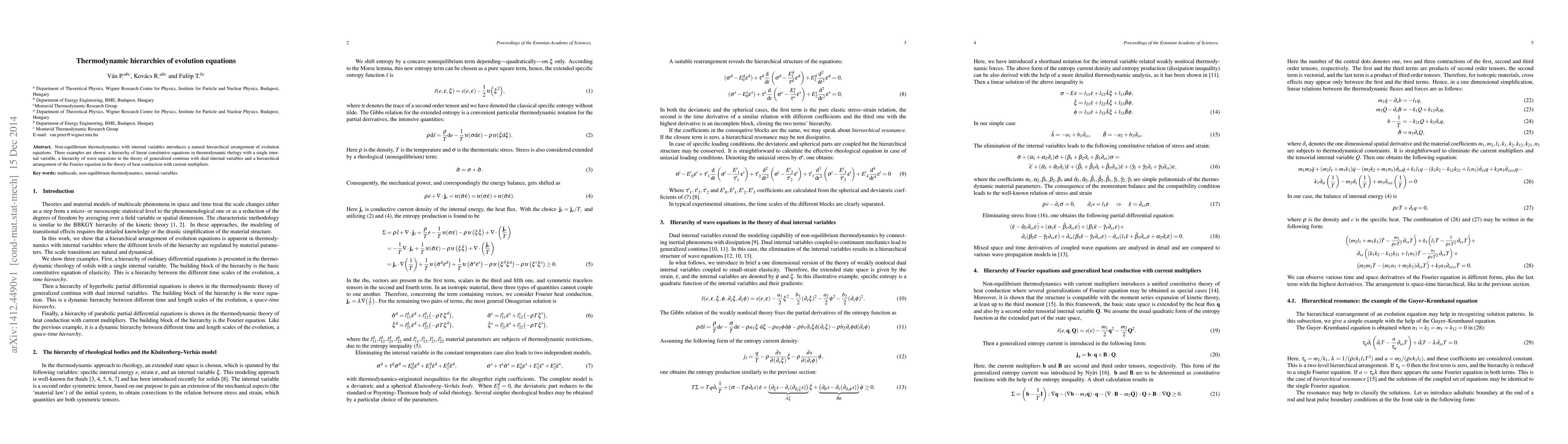 This paper explores thermodynamic hierarchies in non-equilibrium systems, demonstrating hierarchical evolution equations in thermodynamic rheology, generalized continua, and heat conduction, each with distinct internal variables.