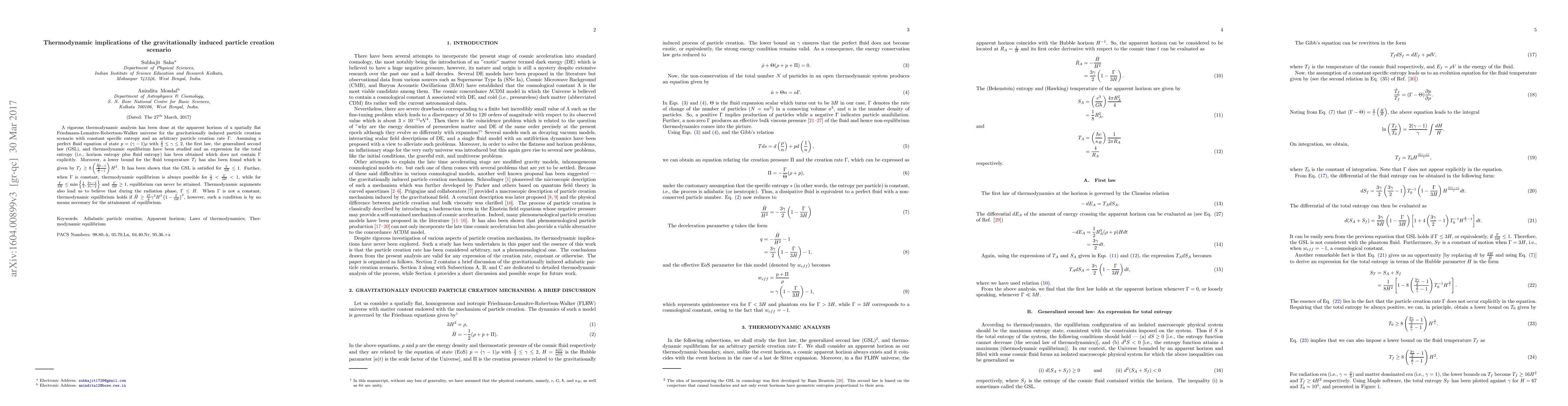 This paper conducts a thermodynamic analysis of gravitationally induced particle creation in a flat FLRW universe, deriving expressions for total entropy and fluid temperature bounds. It finds that the Generalized Second Law holds under certain conditions on the particle creation rate $\Gamma$, and thermodynamic equilibrium is possible under specific constraints on $\Gamma$ relative to the Hubble parameter $H$.