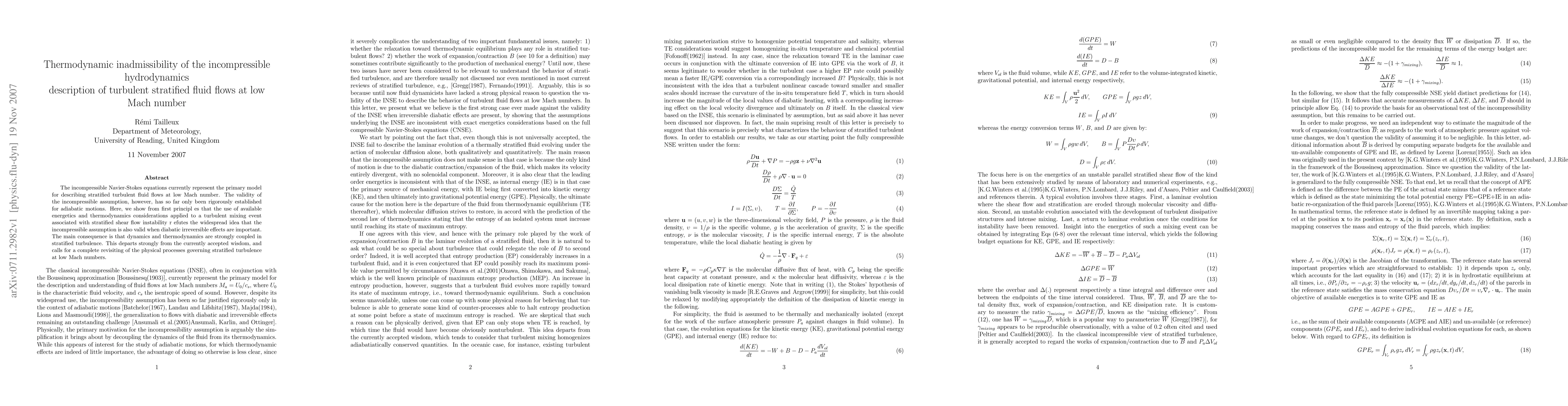 This paper demonstrates that the incompressible Navier-Stokes equations are thermodynamically inadmissible for describing turbulent stratified fluid flows at low Mach numbers under diabatic conditions, challenging the current assumption of their validity. The findings suggest a strong coupling between dynamics and thermodynamics in stratified turbulence, necessitating a reevaluation of the underlying physical processes.