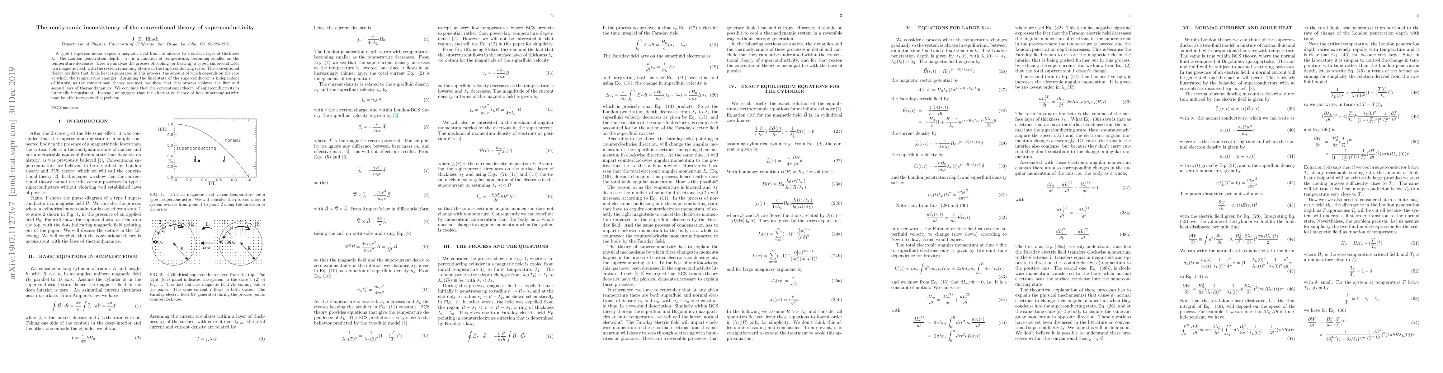 A type I superconductor expels a magnetic field from its interior to a surface layer of thickness $\lambda_L$, the London penetration depth. $\lambda_L$ is a function of temperature, becoming smaller as the temperature decreases. Here we analyze the process of cooling (or heating) a type I superconductor in a magnetic field, with the system remaining always in the superconducting state. The conventional theory predicts that Joule heat is generated in this process, the amount of which depends on the rate at which the temperature changes. Assuming the final state of the superconductor is independent of history, as the conventional theory assumes, we show that this process violates the first and second laws of thermodynamics. We conclude that the conventional theory of superconductivity is internally inconsistent. Instead, we suggest that the alternative theory of hole superconductivity may be able to resolve this problem.