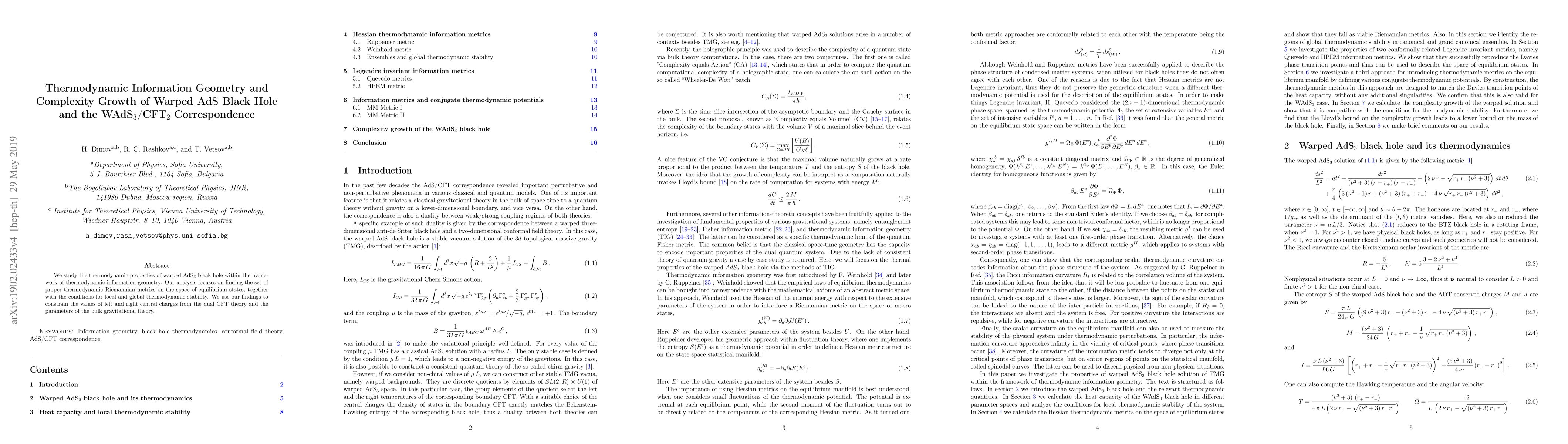 This paper explores the thermodynamic properties of warped AdS3 black holes using information geometry, constraining CFT parameters and gravity theory values for stability.