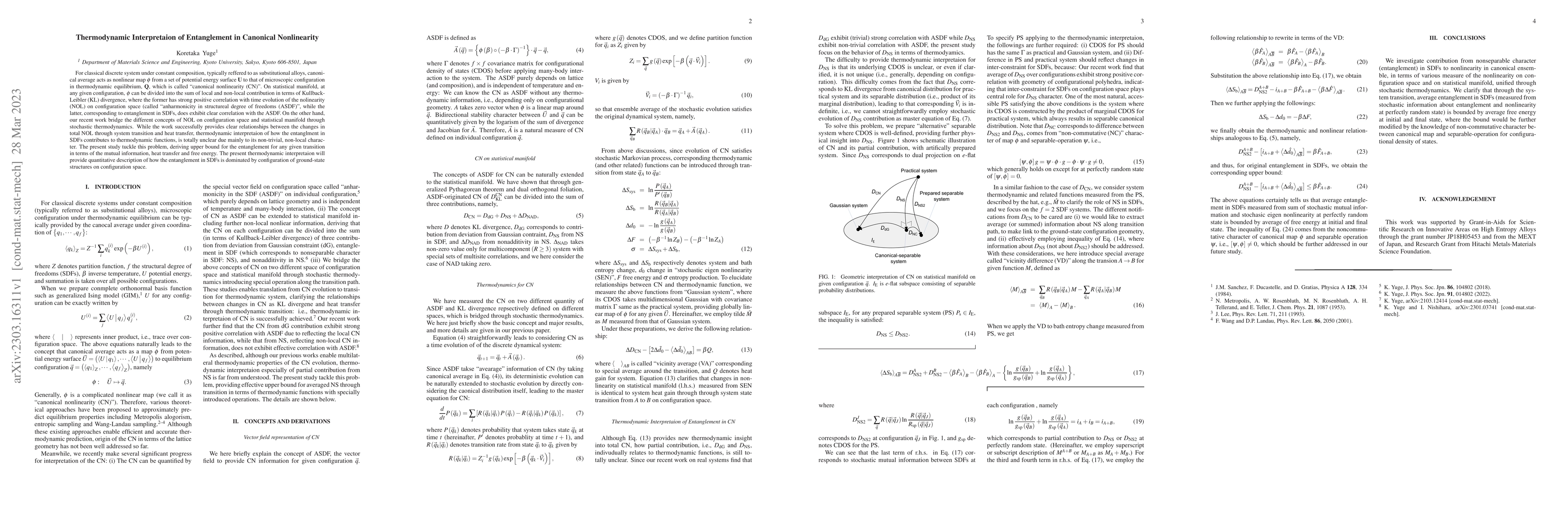 For classical discrete system under constant composition, typically reffered to as substitutional alloys, canonical average acts as nonlinear map F from a set of potential energy surface U to that of microscopic configuration in thermodynamic equilibrium, Q, which is called canonical nonlinearity (CN). On statistical manifold, at any given configuration, F can be divided into the sum of local and non-local contribution in terms of Kullback-Leibler (KL) divergence, where the former has strong positive correlation with time evolution of the nonlinearity (NOL) on configuration space (called anharmonicity in structural degree of freedoms (ASDF), while the latter, corresponding to entanglement in SDFs, does exhibit clear correlation with the ASDF. On the other hand, our recent work bridge the different concepts of NOL on configuration space and statistical manifold through stochastic thermodynamics. While the work successfully provides clear relationships between the changes in total NOL through system transition and heat transfer, thermodynamic interpretation of how the entanglment in SDFs contributes to thermodynamic functions, is totally unclear due mainly to its non-trivial, non-local character. The present study tackle this problem, deriving upper bound for the entanglement for any given transition in terms of the mutual information, heat transfer and free energy. The present thermodynamic interpretaion will provide quantitative description of how the entanglement in SDFs is dominated by configuration of ground-state structures on configuration space.