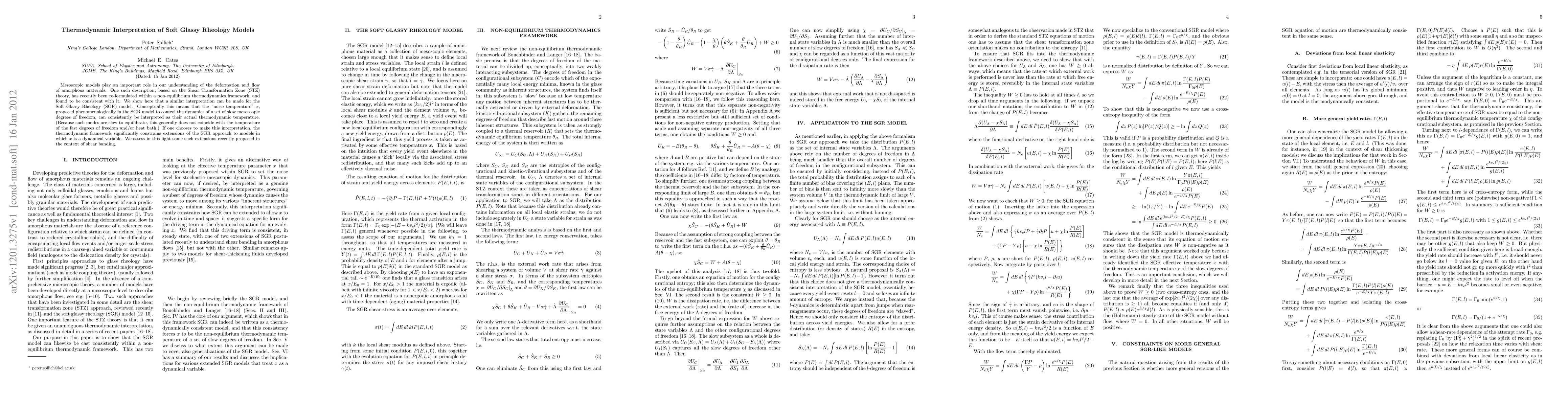 This paper reinterprets the Soft Glassy Rheology (SGR) model within a non-equilibrium thermodynamics framework, showing that the "noise temperature" x can be understood as the actual thermodynamic temperature of slow mesoscopic degrees of freedom, thus constraining extensions of the model where x is a dynamical variable.