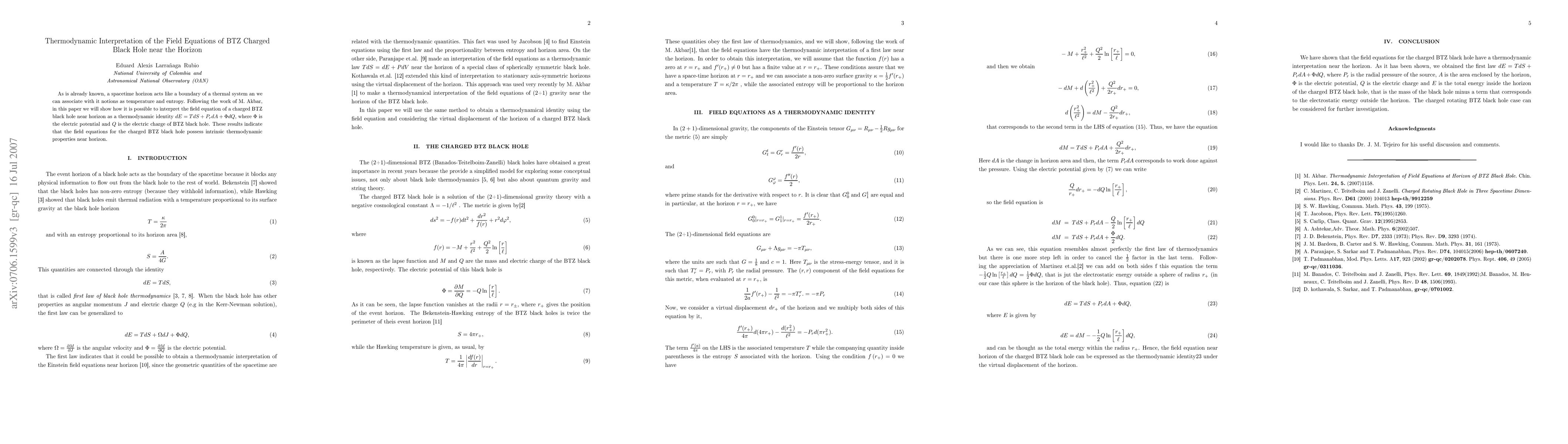 This paper demonstrates how the field equations of a charged BTZ black hole near its horizon can be interpreted thermodynamically, aligning with a thermodynamic identity involving energy, temperature, entropy, pressure, area, electric potential, and charge. These findings reveal intrinsic thermodynamic characteristics of the charged BTZ black hole near its horizon.