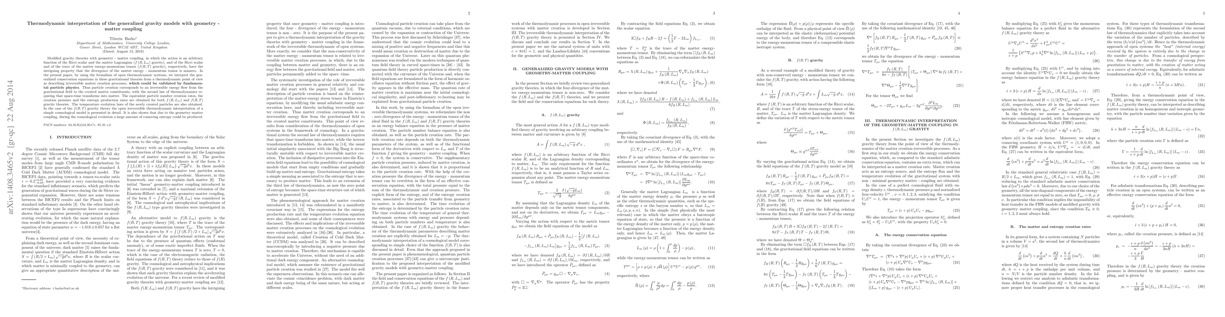 This paper interprets modified gravity models with geometry-matter coupling, specifically $f\left(R,L_m\right)$ and $f(R,T)$ gravities, using thermodynamic principles, showing that they describe irreversible matter creation processes. It derives particle creation rates, creation pressure, and entropy production rates, and presents a detailed thermodynamic interpretation for $f(R,T)$ gravity in a cosmological model.
