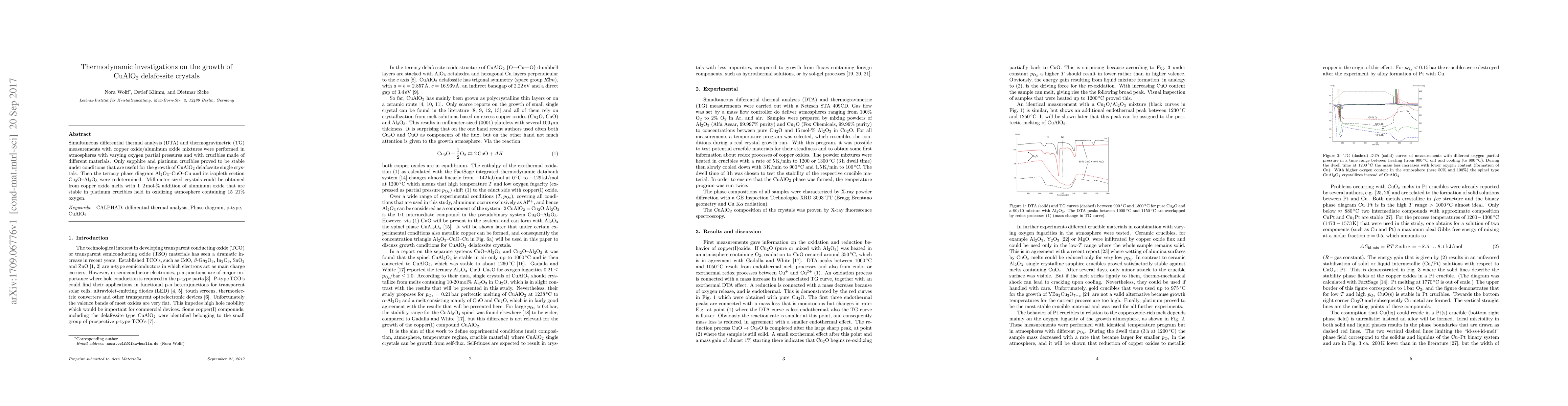 Simultaneous differential thermal analysis (DTA) and thermogravimetric (TG) measurements with copper oxide/aluminum oxide mixtures were performed in atmospheres with varying oxygen partial pressures and with crucibles made of different materials. Only sapphire and platinum crucibles proved to be stable under conditions that are useful for the growth of CuAlO$_2$ delafossite single crystals. Then the ternary phase diagram Al$_2$O$_3$-CuO-Cu and its isopleth section Cu$_2$O-Al$_2$O$_3$ were redetermined. Millimeter sized crystals could be obtained from copper oxide melts with 1-2 mol % addition of aluminum oxide that are stable in platinum crucibles held in oxidizing atmosphere containing 15-21 % oxygen.