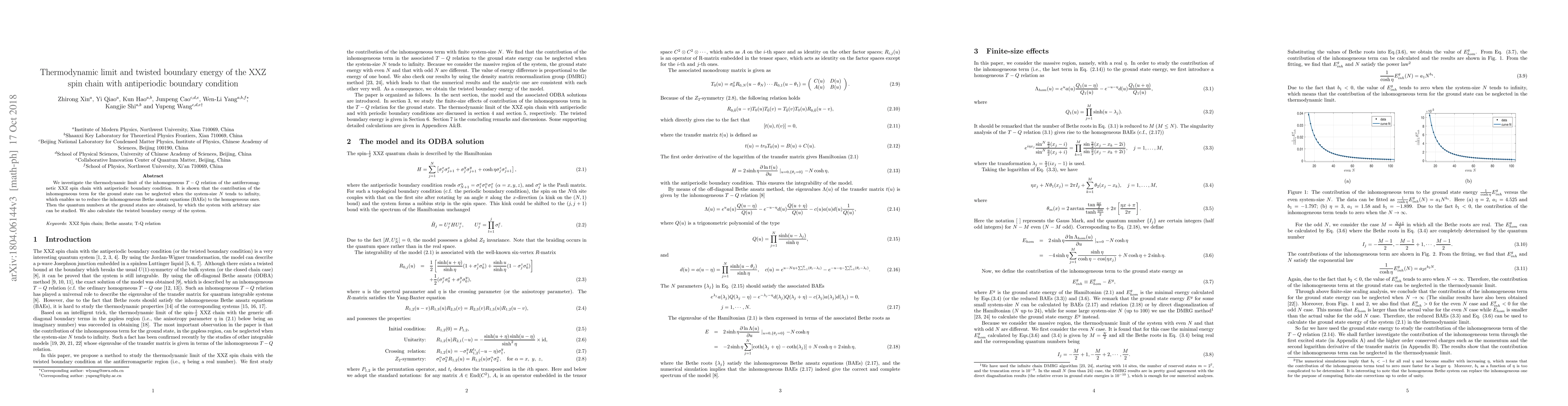 This paper examines the thermodynamic limit of the XXZ spin chain with antiperiodic boundary conditions, demonstrating that the inhomogeneous term's contribution diminishes as the system size approaches infinity, allowing for the simplification of Bethe ansatz equations. Additionally, the study computes the twisted boundary energy of the system.