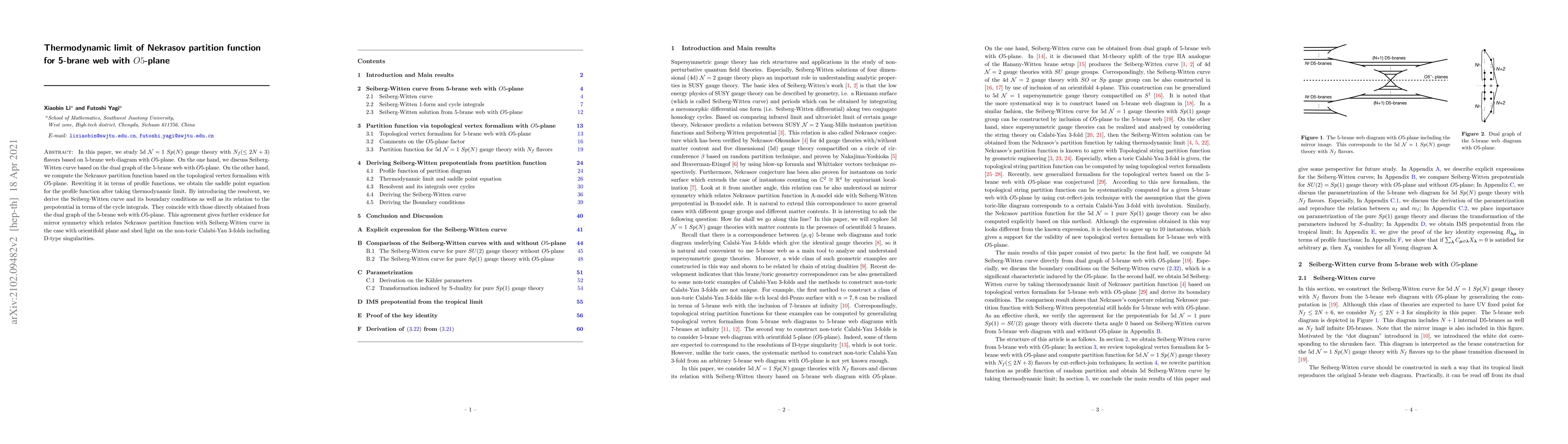 This paper investigates the thermodynamic limit of the Nekrasov partition function for 5d $\mathcal{N}=1$ $Sp(N)$ gauge theory with $O5$-plane, using the 5-brane web diagram. It derives the Seiberg-Witten curve and its boundary conditions through the topological vertex formalism, confirming the consistency with mirror symmetry and providing insights into non-toric Calabi-Yau 3-folds.