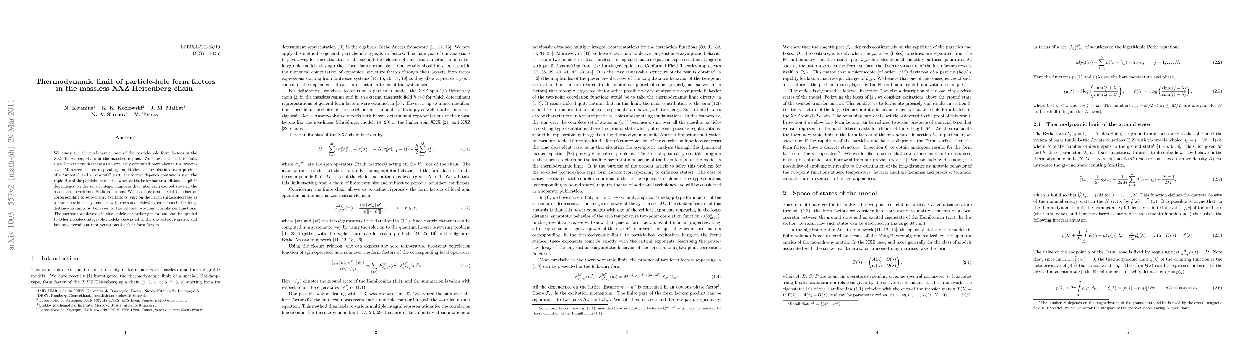 This paper investigates the thermodynamic limit of particle-hole form factors in the massless XXZ Heisenberg chain, revealing a power-law decay with system size. The form factors consist of a smooth part dependent on rapidities and a discrete part tied to excited states, with special form factors near the Fermi surface exhibiting similar decay behavior as two-point correlation functions.