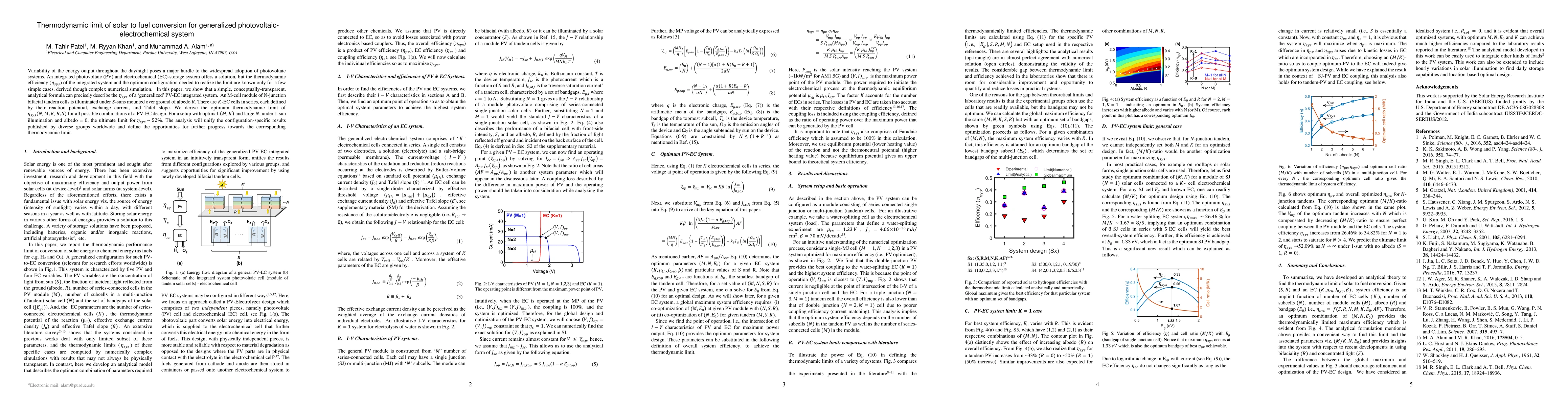 This paper presents an analytical formula to precisely describe the thermodynamic efficiency of a generalized photovoltaic-electrochemical system, deriving the optimum thermodynamic limit for various configurations. The ultimate efficiency limit for an optimal setup under 1-sun illumination and zero albedo is found to be approximately 52%.