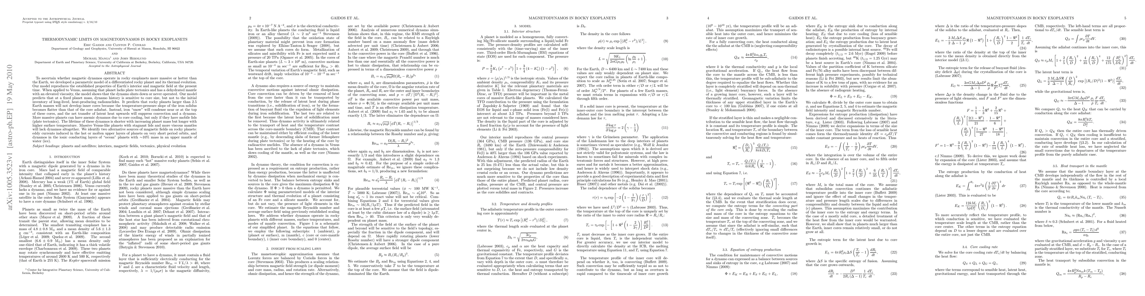 This paper explores the thermodynamic conditions under which magnetic dynamos can operate in rocky exoplanets, finding that larger, more massive planets are unlikely to sustain dynamos due to suppressed convection. It suggests alternative magnetic field sources for certain types of planets, such as eddy currents in hot layers or dynamos in water-rich "ocean" planets.