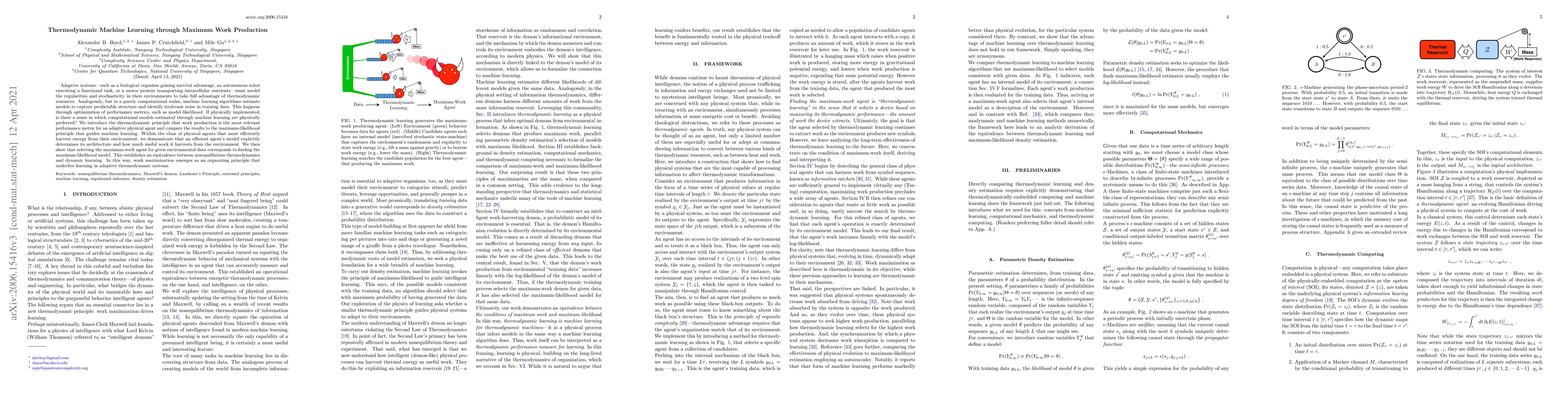 Adaptive systems -- such as a biological organism gaining survival advantage, an autonomous robot executing a functional task, or a motor protein transporting intracellular nutrients -- must model the regularities and stochasticity in their environments to take full advantage of thermodynamic resources. Analogously, but in a purely computational realm, machine learning algorithms estimate models to capture predictable structure and identify irrelevant noise in training data. This happens through optimization of performance metrics, such as model likelihood. If physically implemented, is there a sense in which computational models estimated through machine learning are physically preferred? We introduce the thermodynamic principle that work production is the most relevant performance metric for an adaptive physical agent and compare the results to the maximum-likelihood principle that guides machine learning. Within the class of physical agents that most efficiently harvest energy from their environment, we demonstrate that an efficient agent's model explicitly determines its architecture and how much useful work it harvests from the environment. We then show that selecting the maximum-work agent for given environmental data corresponds to finding the maximum-likelihood model. This establishes an equivalence between nonequilibrium thermodynamics and dynamic learning. In this way, work maximization emerges as an organizing principle that underlies learning in adaptive thermodynamic systems.