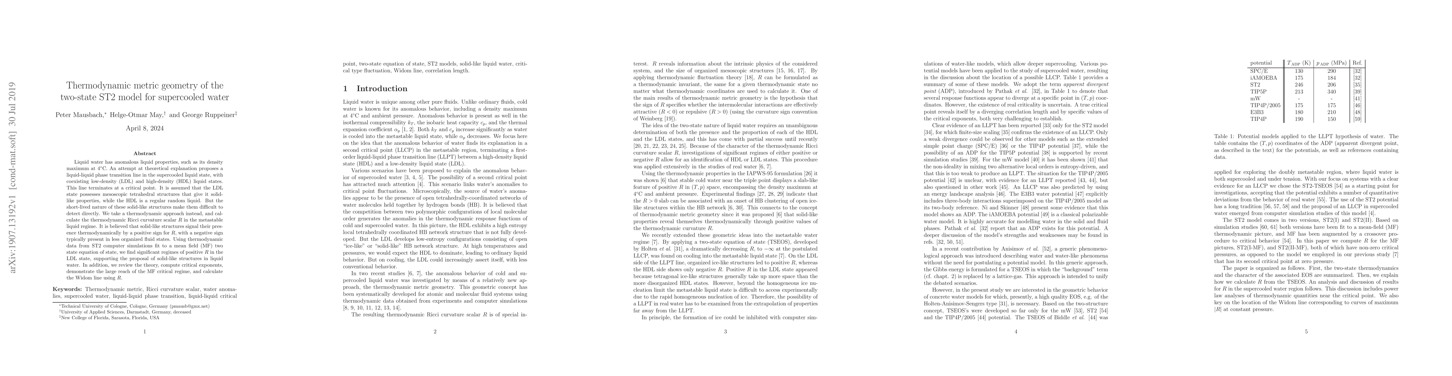 Liquid water has anomalous liquid properties, such as its density maximum at 4\degree C. An attempt at theoretical explanation proposes a liquid-liquid phase transition line in the supercooled liquid state, with coexisting low-density (LDL) and high-density (HDL) liquid states. This line terminates at a critical point. It is assumed that the LDL state possesses mesoscopic tetrahedral structures that give it solid-like properties, while the HDL is a regular random liquid. But the short-lived nature of these solid-like structures make them difficult to detect directly. We take a thermodynamic approach instead, and calculate the thermodynamic Ricci curvature scalar $R$ in the metastable liquid regime. It is believed that solid-like structures signal their presence thermodynamically by a positive sign for $R$, with a negative sign typically present in less organized fluid states. Using thermodynamic data from ST2 computer simulations fit to a mean field (MF) two state equation of state, we find significant regimes of positive $R$ in the LDL state, supporting the proposal of solid-like structures in liquid water. In addition, we review the theory, compute critical exponents, demonstrate the large reach of the MF critical regime, and calculate the Widom line using $R$.