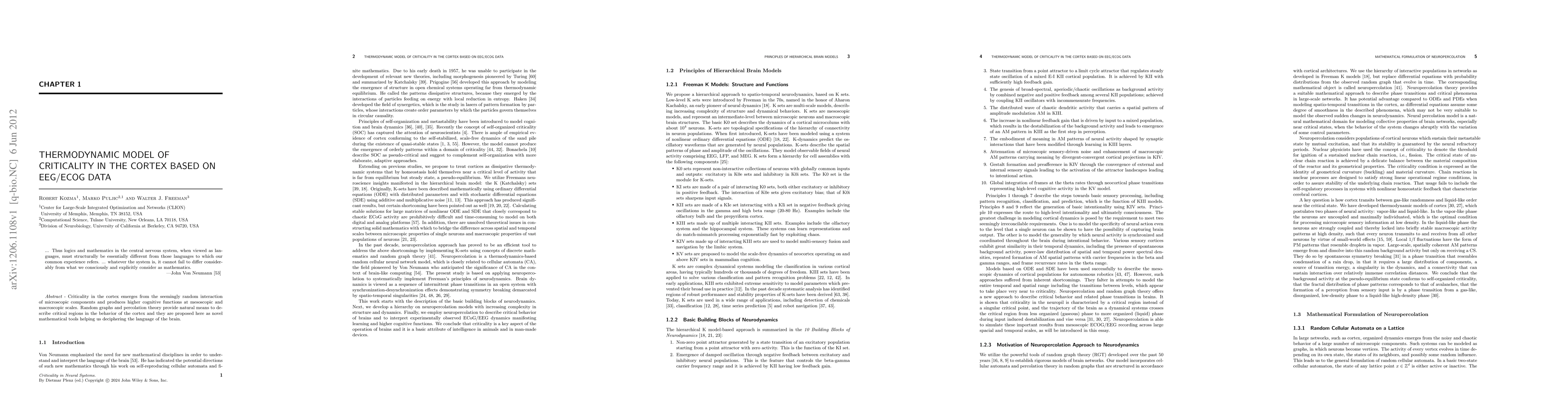 This paper proposes a thermodynamic model using random graphs and percolation theory to describe criticality in the cortex, aiming to decode higher cognitive functions through EEG/ECOG data analysis. The model leverages these mathematical tools to interpret the complex interactions within the brain's neural network.