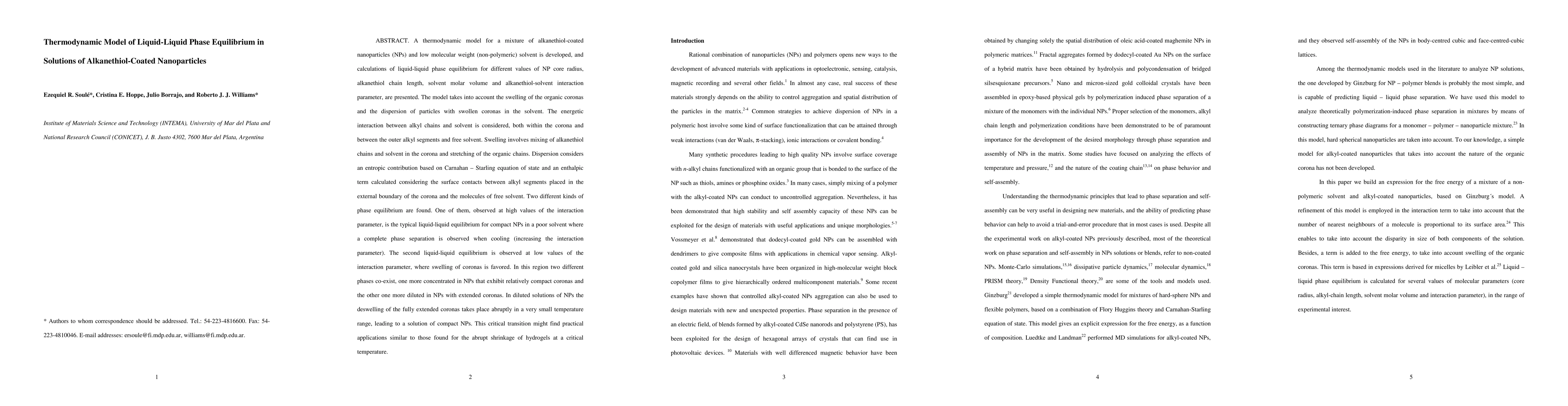 A thermodynamic model for a mixture of alkanethiol-coated nanoparticles (NPs) and low molecular weight (non-polymeric) solvent is developed, and calculations of liquid-liquid phase equilibrium for different values of NP core radius, alkanethiol chain length, solvent molar volume and alkanethiol-solvent interaction parameter, are presented. The model takes into account the swelling of the organic coronas and the dispersion of particles with swollen coronas in the solvent. The energetic interaction between alkyl chains and solvent is considered, both within the corona and between the outer alkyl segments and free solvent. Swelling involves mixing of alkanethiol chains and solvent in the corona and stretching of the organic chains. Dispersion considers an entropic contribution based on Carnahan Starling equation of state and an enthalpic term calculated considering the surface contacts between alkyl segments placed in the external boundary of the corona and the molecules of free solvent. Two different kinds of phase equilibrium are found. One of them, observed at high values of the interaction parameter, is the typical liquid-liquid equilibrium for compact NPs in a poor solvent where a complete phase separation is observed when cooling (increasing the interaction parameter). The second liquid-liquid equilibrium is observed at low values of the interaction parameter, where swelling of coronas is favored. In this region two different phases co-exist, one more concentrated in NPs that exhibit relatively compact coronas and the other one more diluted in NPs with extended coronas. In diluted solutions of NPs the deswelling of the fully extended coronas takes place abruptly in a very small temperature range, leading to a solution of compact NPs. This critical transition might find practical applications similar to those found for the abrupt shrinkage of hydrogels at a critical temperature.