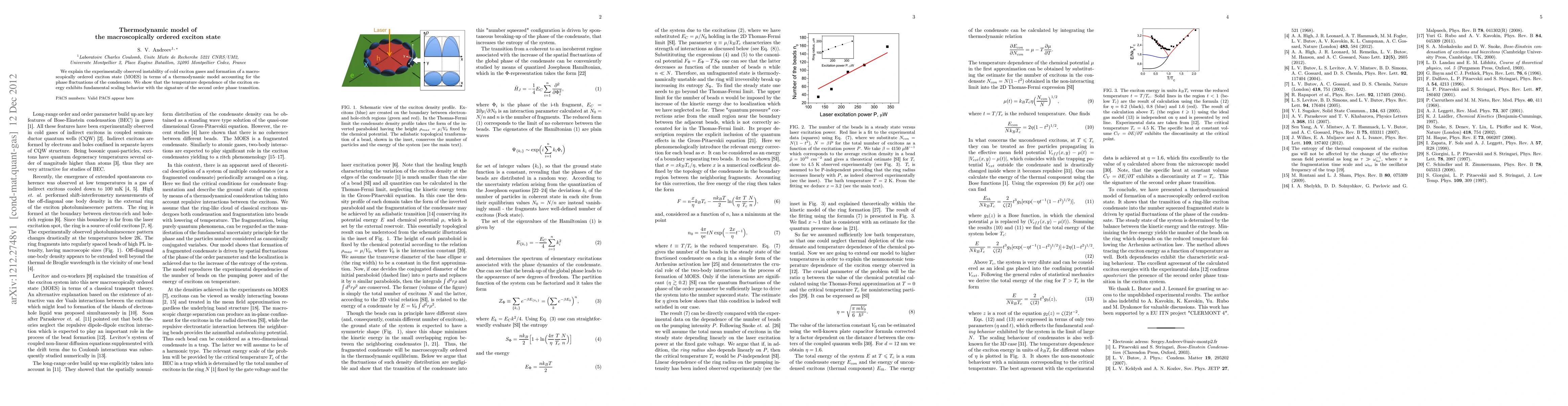 We explain the experimentally observed instability of cold exciton gases and formation of a macroscopically ordered exciton state (MOES) in terms of a thermodynamic model accounting for the phase fluctuations of the condensate. We show that the temperature dependence of the exciton energy exhibits fundamental scaling behavior with the signature of the second order phase transition.