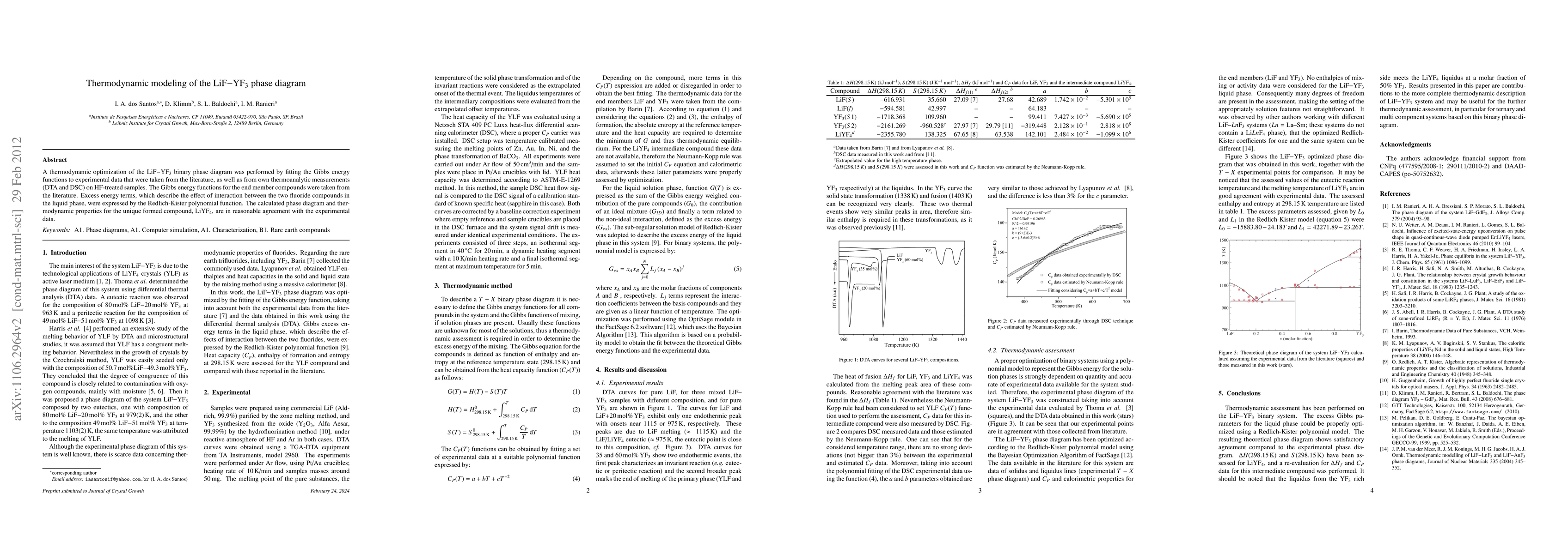 A thermodynamic optimization of the LiF-YF3 binary phase diagram was performed by fitting the Gibbs energy functions to experimental data that were taken from the literature, as well as from own thermoanalytic measurements (DTA and DSC) on HF-treated samples. The Gibbs energy functions for the end member compounds were taken from the literature. Excess energy terms, which describe the effect of interaction between the two fluoride compounds in the liquid phase, were expressed by the Redlich-Kister polynomial function. The calculated phase diagram and thermodynamic properties for the unique formed compound, LiYF4, are in reasonable agreement with the experimental data.