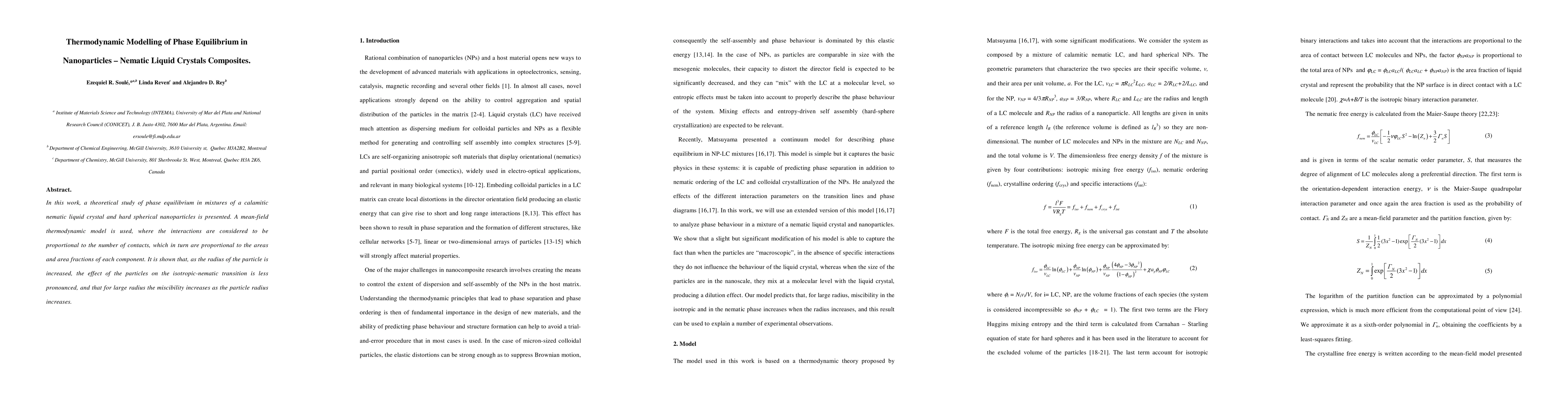 This research develops a theoretical model using mean-field thermodynamics to study phase equilibrium in mixtures of nematic liquid crystals and hard spherical nanoparticles. The study finds that as nanoparticle radius increases, their impact on the isotropic-nematic phase transition becomes less significant, and miscibility between particles and liquid crystal enhances with larger particle radii.