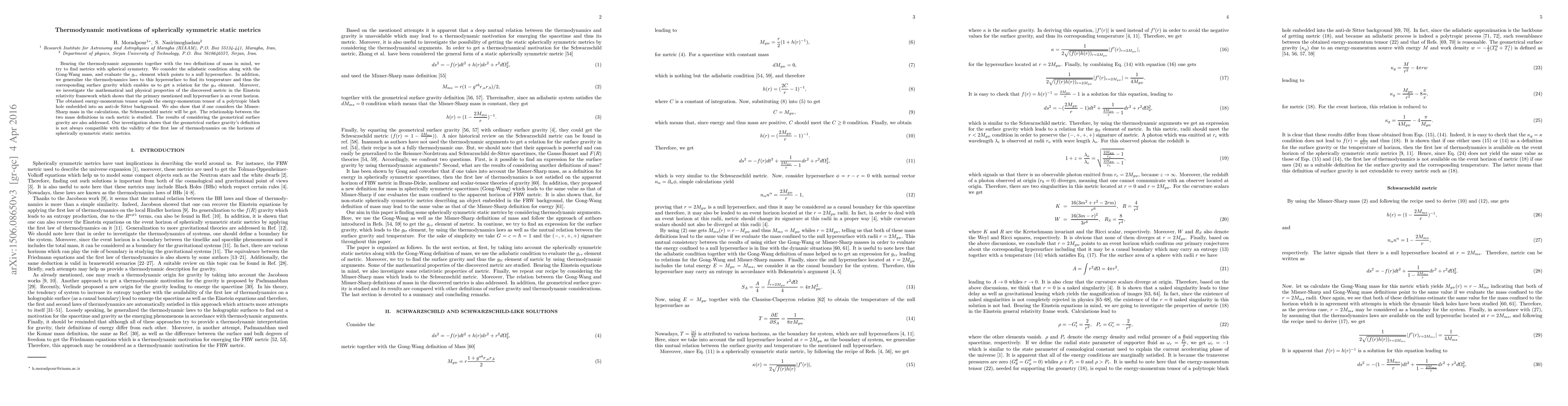This paper explores spherically symmetric static metrics through thermodynamic principles, deriving a relation for the $g_{tt}$ element and identifying a null hypersurface as an event horizon. It also examines the relationship between the Gong-Wang and Misner-Sharp mass definitions, finding that the latter recovers the Schwarzschild metric. However, it concludes that the geometrical surface gravity definition does not always align with the first law of thermodynamics.
