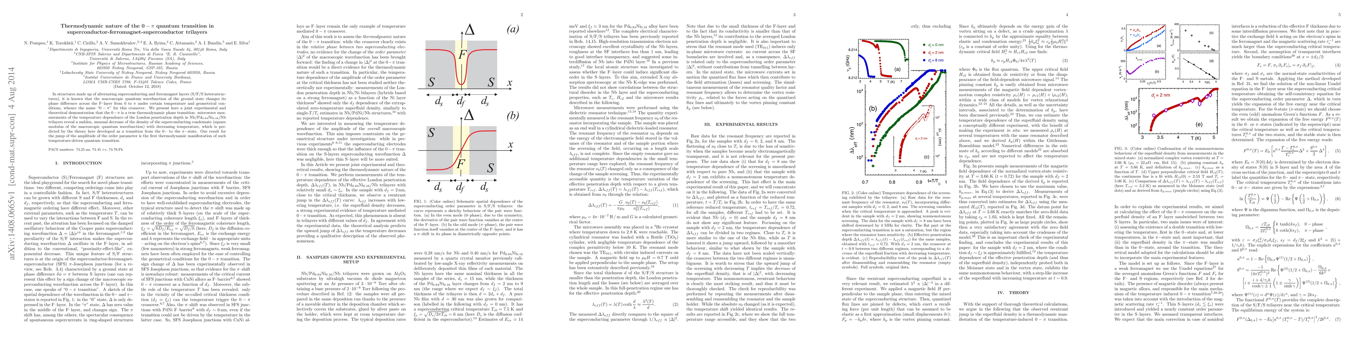 In structures made up of alternating superconducting and ferromagnet layers (S/F/S heterostructures), it is known that the macroscopic quantum wavefunction of the ground state changes its phase difference across the F--layer from 0 to PI under certain temperature and geometrical conditions, whence the name "0-PI" for this crossover. We present here a joint experimental and theoretical demonstration that the "0-PI" is a true thermodynamic phase transition: microwave measurements of the temperature dependence of the London penetration depth in Nb/Pd_0.84Ni_0.16/Nb trilayers reveal a sudden, unusual decrease of the density of the superconducting condensate (square modulus of the macroscopic quantum wavefunction) with decreasing temperature, which is predicted by the theory here developed as a transition from the 0- to the PI-state. Our result for the jump of the amplitude of the order parameter is the first thermodynamic manifestation of such temperature-driven quantum transition.