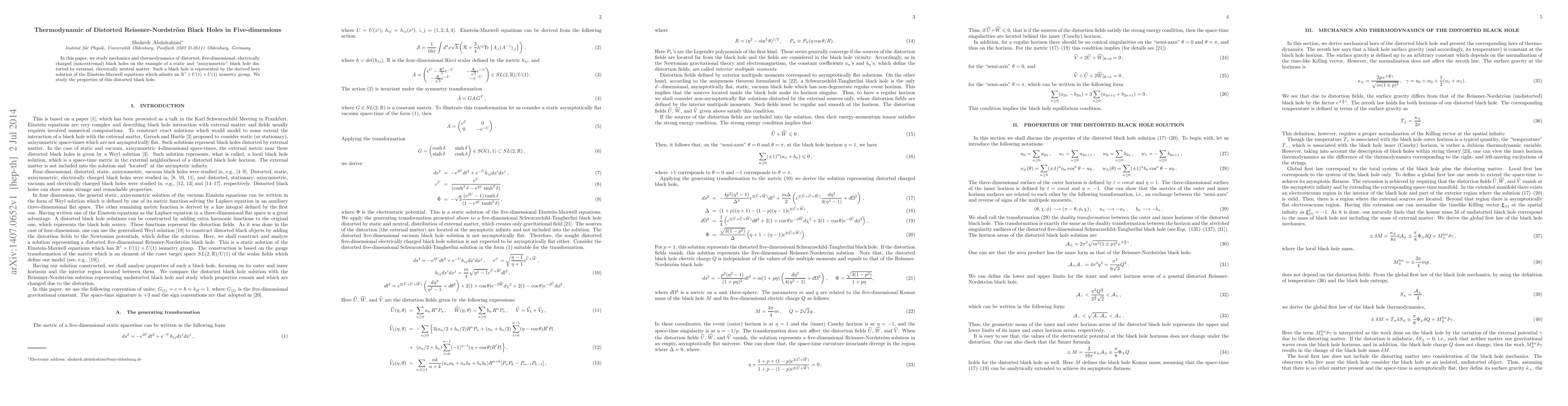 This paper investigates the mechanics and thermodynamics of a five-dimensional, electrically charged black hole distorted by neutral matter, focusing on a static, axisymmetric solution of the Einstein-Maxwell equations. The study examines the properties of this distorted black hole.
