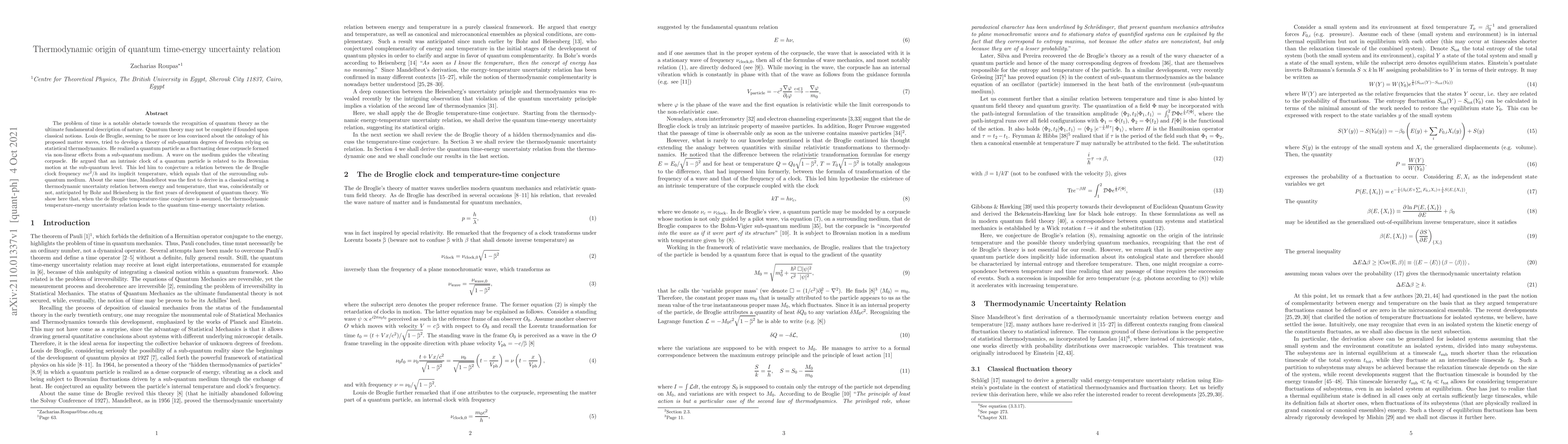The problem of time is a notable obstacle towards the recognition of quantum theory as the ultimate fundamental description of nature. Quantum theory may not be complete if founded upon classical notions. Louis de Broglie, seeming to be more or less convinced about the ontology of his proposed matter waves, tried to develop a theory of sub-quantum degrees of freedom relying on statistical thermodynamics. He realized a quantum particle as a fluctuating dense corpuscle formed via non-linear effects from a sub-quantum medium. A wave on the medium guides the vibrating corpuscle. He argued that an intrinsic clock of a quantum particle is related to its Brownian motion at the sub-quantum level. This led him to conjecture a relation between the de Broglie clock frequency $m c^2/h$ and its implicit temperature, which equals that of the surrounding sub-quantum medium. About the same time, Mandelbrot was the first to derive in a classical setting a thermodynamic uncertainty relation between energy and temperature, that was, coincidentally or not, anticipated by Bohr and Heisenberg in the first years of development of quantum theory. We show here that, when the de Broglie temperature-time conjecture is assumed, the thermodynamic temperature-energy uncertainty relation leads to the quantum time-energy uncertainty relation.