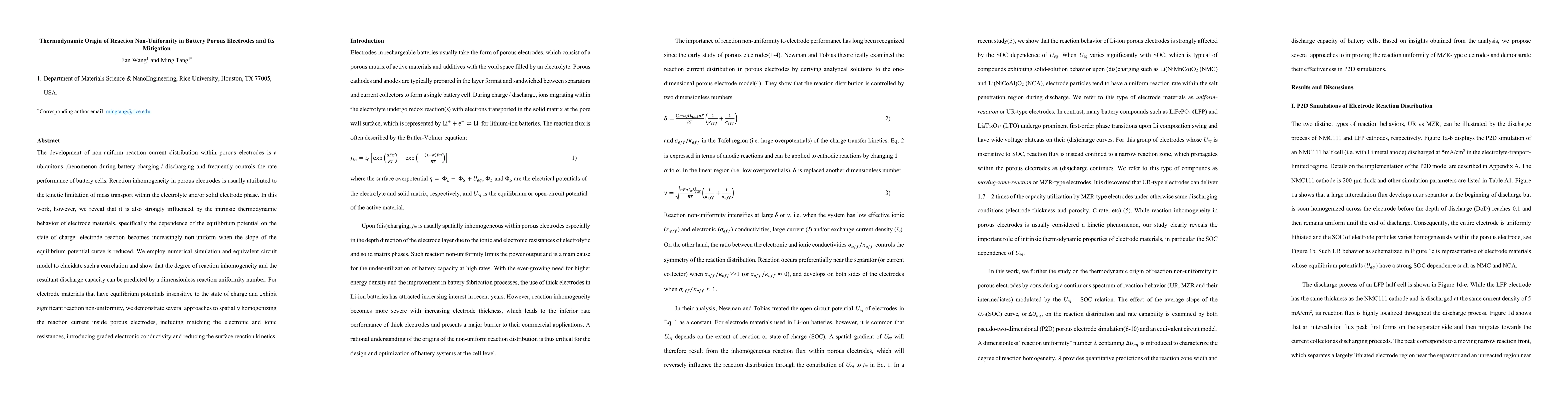 This paper investigates the thermodynamic origins of reaction non-uniformity in battery porous electrodes, revealing that intrinsic thermodynamic behavior, specifically the equilibrium potential's dependence on the state of charge, significantly influences this phenomenon. The authors propose methods to mitigate reaction inhomogeneity through various strategies, including adjusting electronic and ionic resistances.