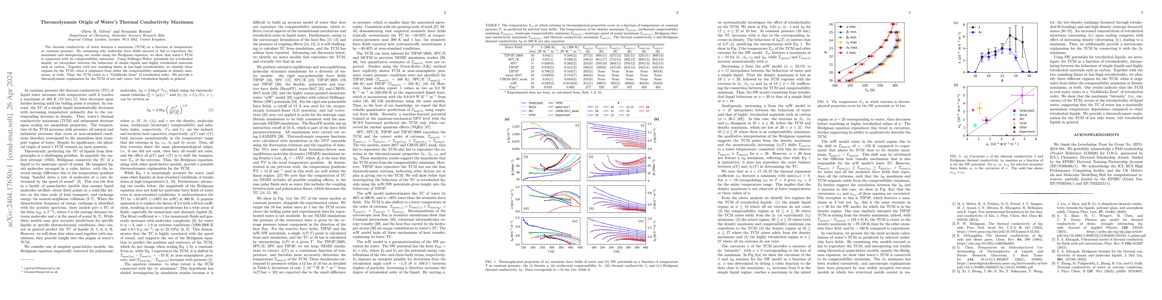 The paper identifies that water's thermal conductivity maximum (TCM) is thermodynamically linked to its compressibility minimum, explained through the Bridgman equation and Stillinger-Weber potentials. The TCM exists in a "Goldilocks Zone" of tetrahedral order, revealing three regimes based on compressibility and density.