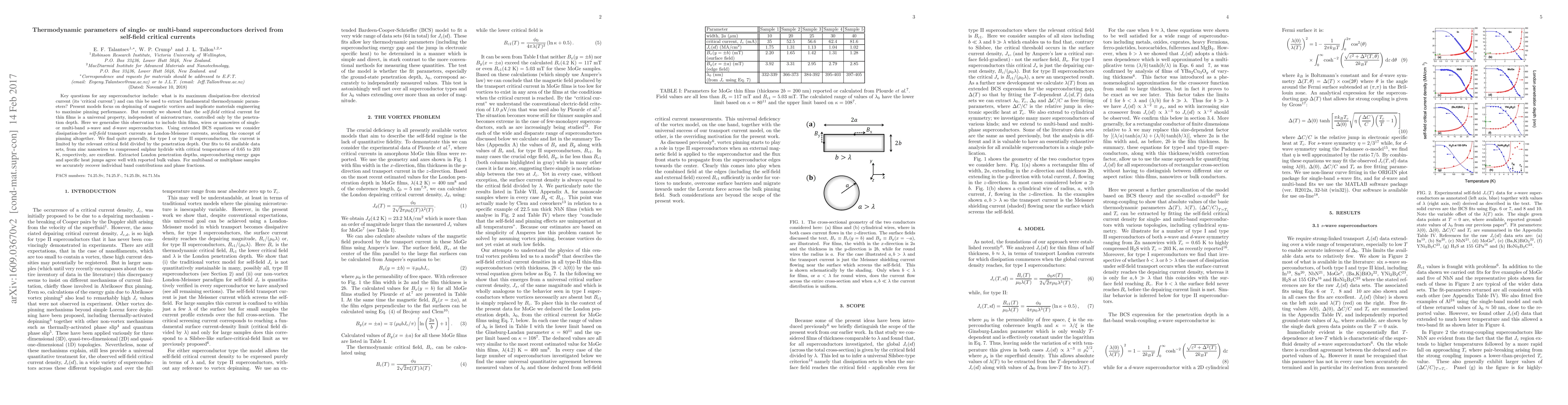 This paper generalizes the concept of self-field critical currents to single- and multi-band superconductors, demonstrating that these currents can be used to extract fundamental thermodynamic parameters independent of microstructure. The study finds that the critical current is limited by the critical field divided by the penetration depth, and fits to a wide range of superconductors confirm the accuracy of extracted thermodynamic parameters.
