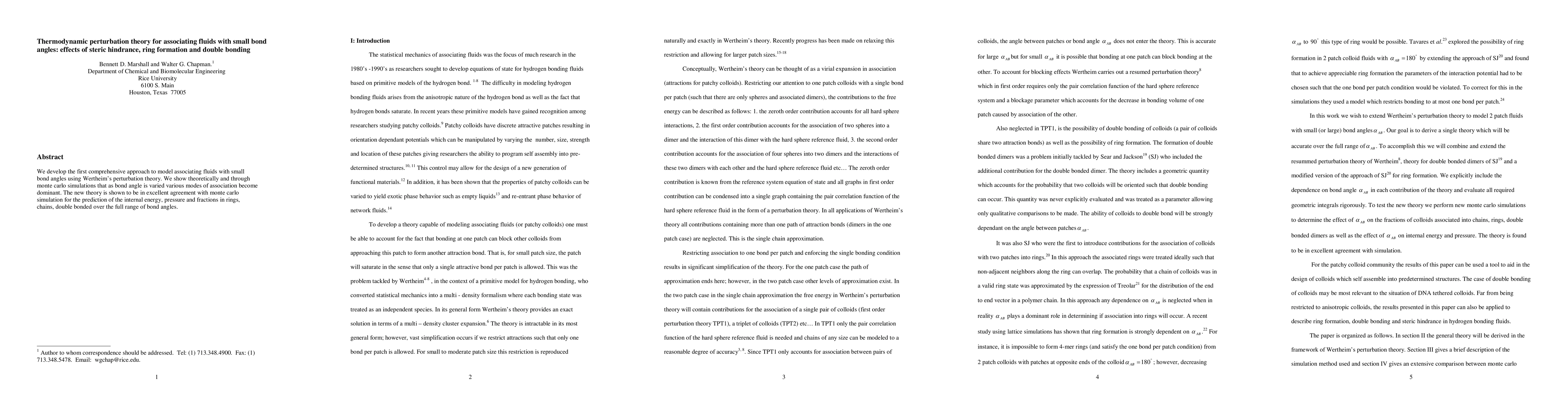 We develop the first comprehensive approach to model associating fluids with small bond angles using Wertheim's perturbation theory. We show theoretically and through monte carlo simulations that as bond angle is varied various modes of association become dominant. The new theory is shown to be in excellent agreement with monte carlo simulation for the prediction of the internal energy, pressure and fractions in rings, chains, double bonded over the full range of bond angles.