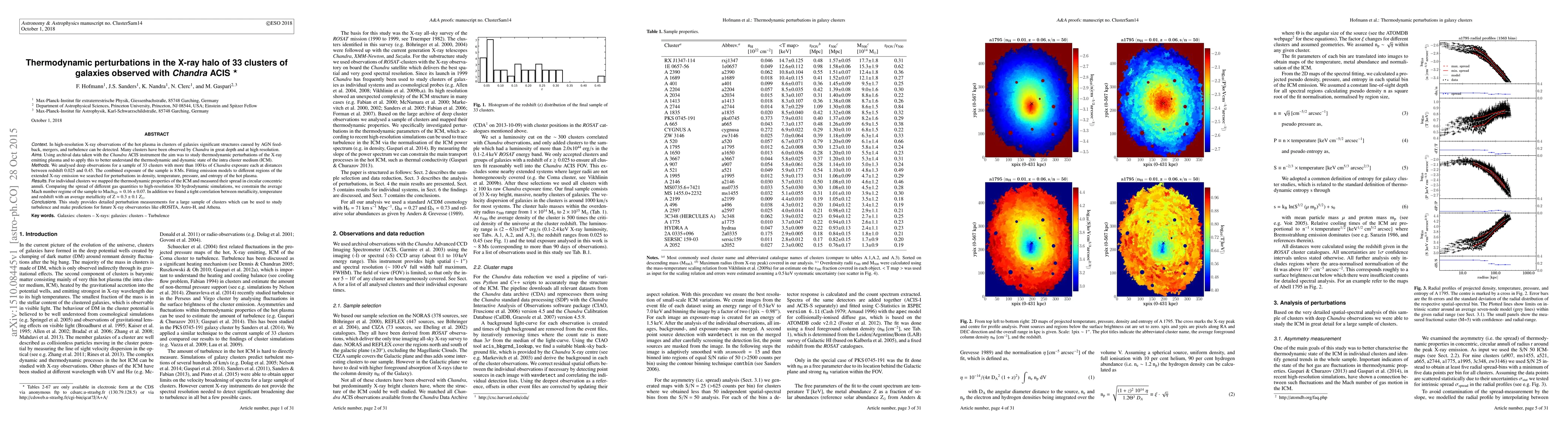 This study analyzes thermodynamic perturbations in the X-ray halos of 33 galaxy clusters using Chandra ACIS data, revealing significant structures due to AGN feedback and mergers. The research constrains the average Mach number and finds correlations between metallicity, temperature, and redshift, providing insights for future X-ray observatories.