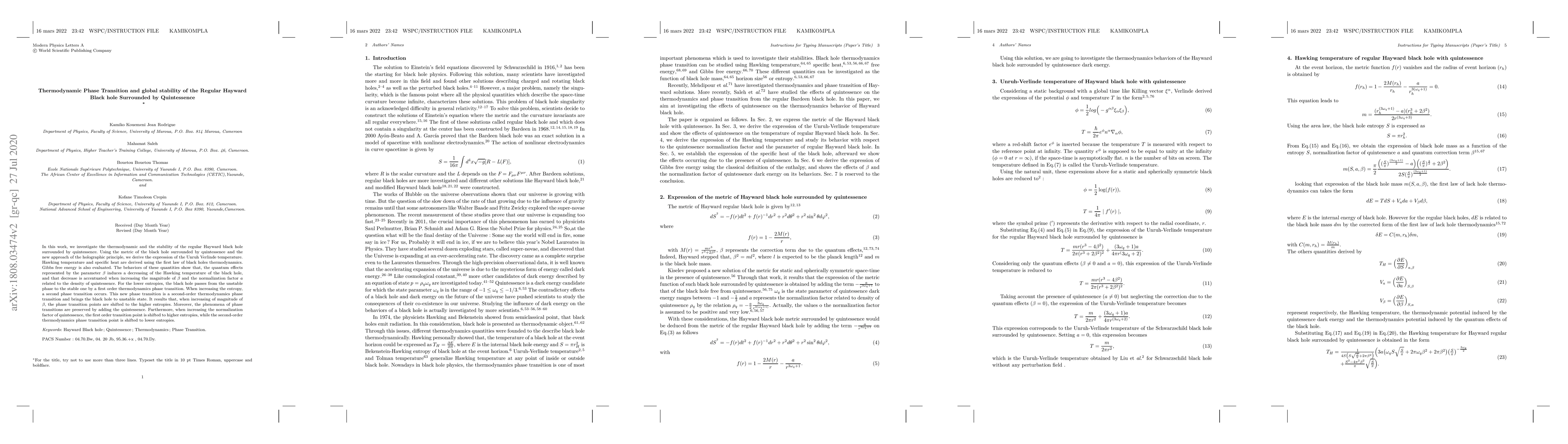 This paper investigates the thermodynamic properties and stability of the regular Hayward black hole enveloped by quintessence, revealing a first-order phase transition at lower entropy and a second-order phase transition at higher entropy. The study shows that quantum effects, represented by parameter $\beta$, decrease the Hawking temperature, with the transition points shifting to higher entropies as $\beta$ and quintessence density increase.