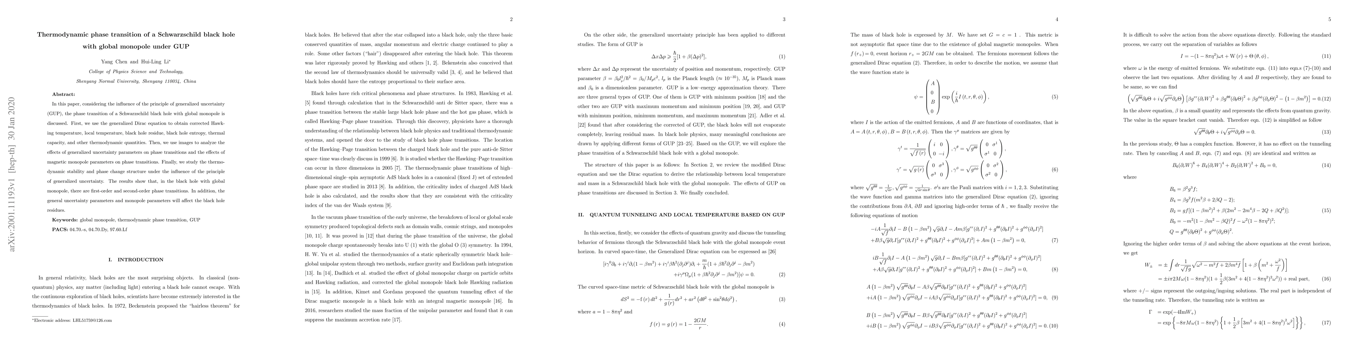 In this paper, considering the influence of the principle of generalized uncertainty (GUP), the phase transition of a Schwarzschild black hole with global monopole is discussed. First, we use the generalized Dirac equation to obtain corrected Hawking temperature, local temperature, black hole residue, black hole entropy, thermal capacity, and other thermodynamic quantities. Then, we use images to analyze the effects of generalized uncertainty parameters on phase transitions and the effects of magnetic monopole parameters on phase transitions. Finally, we study the thermodynamic stability and phase change structure under the influence of the principle of generalized uncertainty. The results show that, in the black hole with global monopole, there are first-order and second-order phase transitions. In addition, the general uncertainty parameters and monopole parameters will affect the black hole residues.