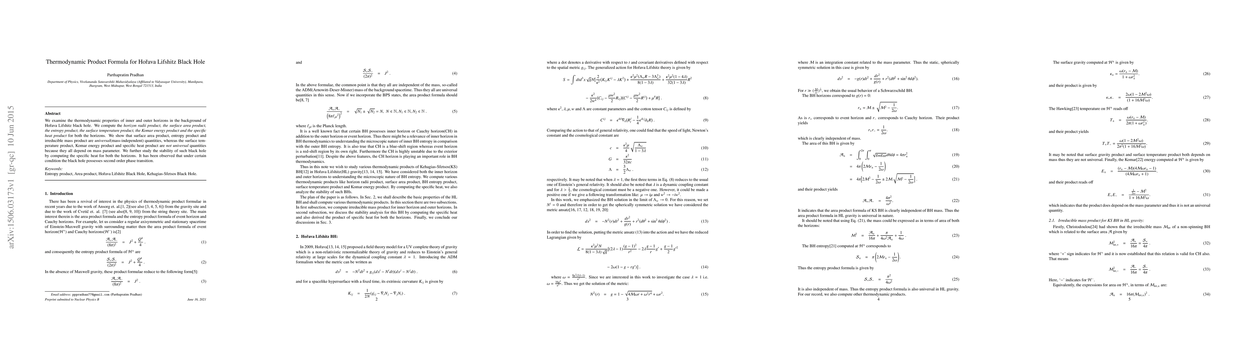 We examine the thermodynamic properties of inner and outer horizons in the background of Ho\v{r}ava Lifshitz black hole. We compute the \emph{horizon radii product, the surface area product, the entropy product, the surface temperature product, the Komar energy product and the specific heat product} for both the horizons of said black hole. We show that surface area product, entropy product and irreducible mass product are \emph{universal} quantities, whereas the surface temperature product, Komar energy product and specific heat product are \emph{not universal} quantities because they all are depends on mass parameter. We also observe that the \emph{First law} of black hole thermodynamics and \emph {Smarr-Gibbs-Duhem } relations do not hold for this black hole. The underlying reason behind this failure due to the scale invariance of the coupling constant. We further derive the \emph{Smarr mass formula} and \emph{Christodolou-Ruffini mass formula} for such black hole spacetime. Moreover we study the stability of such black hole by computing the specific heat for both the horizons. It has been observed that under certain condition the black hole possesses second order phase transition.