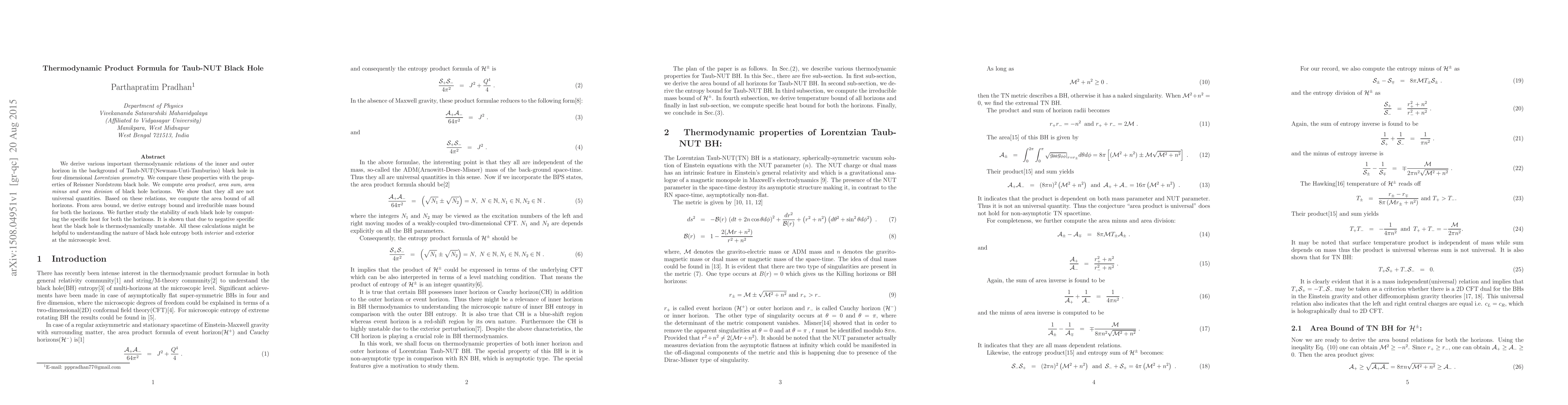 We derive various important thermodynamic relations of the inner and outer horizon in the background of Taub-NUT(Newman-Unti-Tamburino) black hole in four dimensional \emph{Lorentzian geometry}. We compare these properties with the properties of Reissner Nordstr{\o}m black hole. We compute \emph{area product, area sum, area minus and area division} of black hole horizons. We show that they all are not universal quantities. Based on these relations, we compute the area bound of all horizons. From area bound, we derive entropy bound and irreducible mass bound for both the horizons. We further study the stability of such black hole by computing the specific heat for both the horizons. It is shown that due to negative specific heat the black hole is thermodynamically unstable. All these calculations might be helpful to understanding the nature of black hole entropy both \emph{interior} and exterior at the microscopic level.
