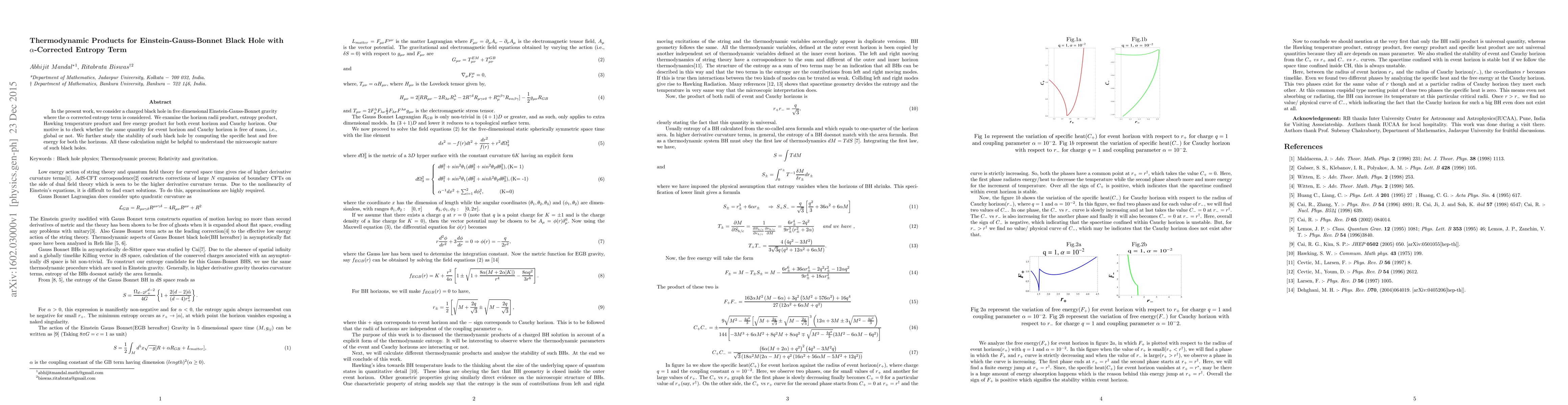 In the present work, we consider a charged black hole in five dimensional Einstein-Gauss-Bonnet gravity where the {\alpha} corrected entropy term is considered. We examine the horizon radii product, entropy product, Hawking temperature product and free energy product for both event horizon and Cauchy horizon. Our motive is to check whether the same quantity for event horizon and Cauchy horizon is free of mass, i.e., global or not. We further study the stability of such black hole by computing the specific heat and free energy for both the horizons. All these calculation might be helpful to understand the microscopic nature of such black holes.