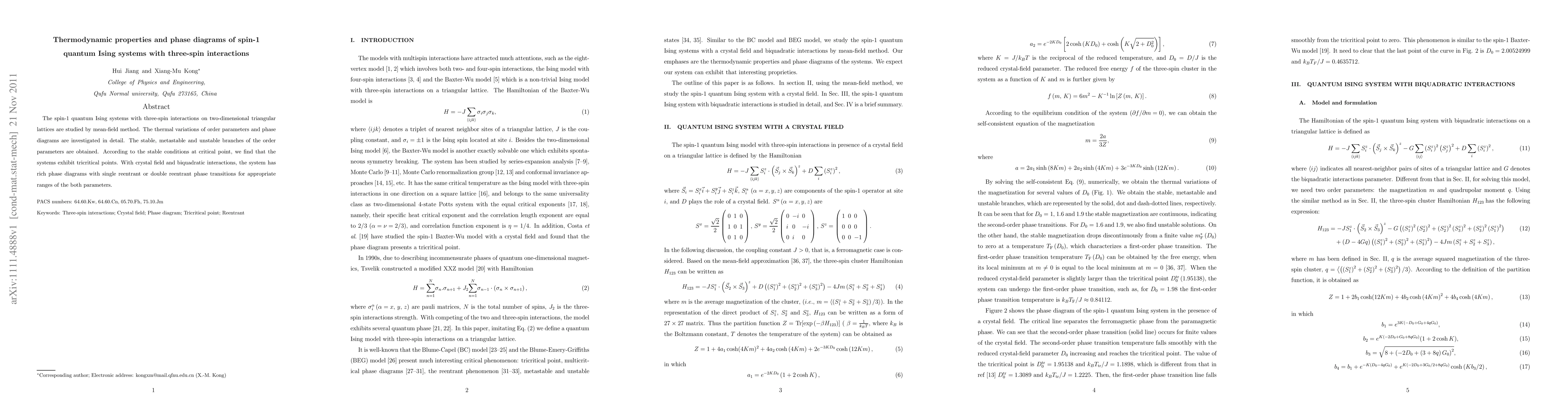 This paper investigates spin-1 quantum Ising systems with three-spin interactions on triangular lattices using mean-field theory, revealing detailed thermal variations and phase diagrams. The study identifies tricritical points and shows complex phase transitions, including single or double reentrant phases, depending on crystal field and biquadratic interaction parameters.