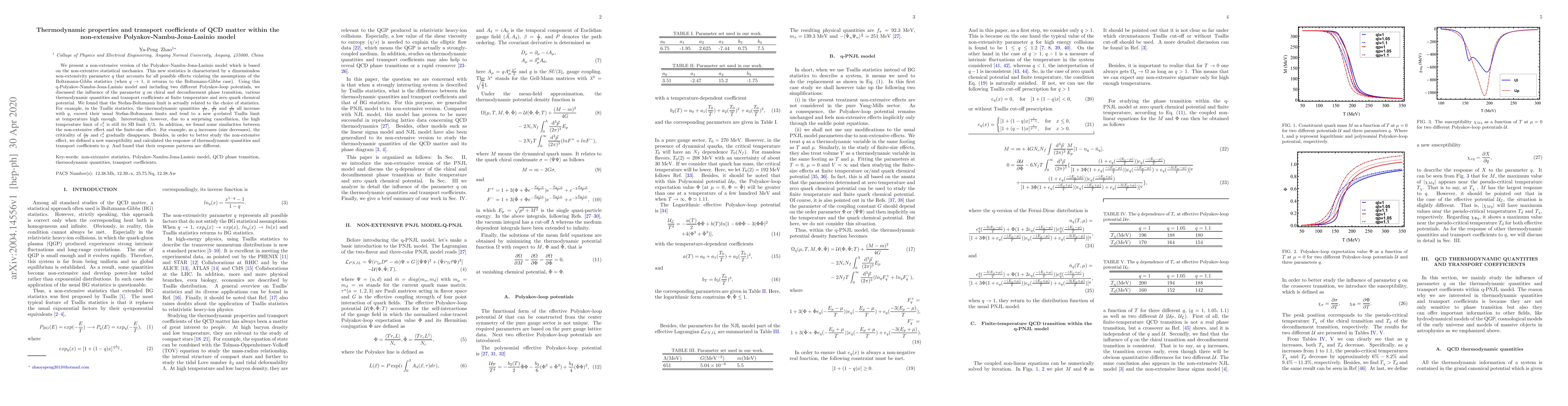 We present a non-extensive version of the Polyakov-Nambu-Jona-Lasinio model which is based on the non-extentive statistical mechanics. This new statistics is characterized by a dimensionless non-extensivity parameter $q$ that accounts for all possible effects violating the assumptions of the Boltzmann-Gibbs statistics (when $q\rightarrow1$, it returns to the Boltzmann-Gibbs case). Using this q-Polyakov-Nambu-Jona-Lasinio model and including two different Polyakov-loop potentials, we discussed the influence of the parameter $q$ on chiral and deconfinement phase transition, various thermodynamic quantities and transport coefficients at finite temperature and zero quark chemical potential. We found that the Stefan-Boltzmann limit is actually related to the choice of statistics. For example, in the Tsallis statistics, the thermodynamic quantities $\frac{\epsilon}{T^{4}}$, $\frac{p}{T^{4}}$ and $\frac{s}{T^{3}}$ all increase with $q$, exceed their usual Stefan-Boltzmann limits and tend to a new $q$-related Tsallis limit at temperature high enough. Interestingly, however, due to a surprising cancellation, the high temperature limit of $c_{s}^{2}$ is still its SB limit $1/3$. In addition, we found some similarities between the non-extensive effect and the finite-size effect. For example, as $q$ increases (size decreases), the criticality of $\frac{c_{v}}{T^{3}}$ and $c_{s}^{2}$ gradually disappears. Besides, in order to better study the non-extensive effect, we defined a new susceptibility and calculated the response of thermodynamic quantities and transport coefficients to $q$. And found that their response patterns are different.