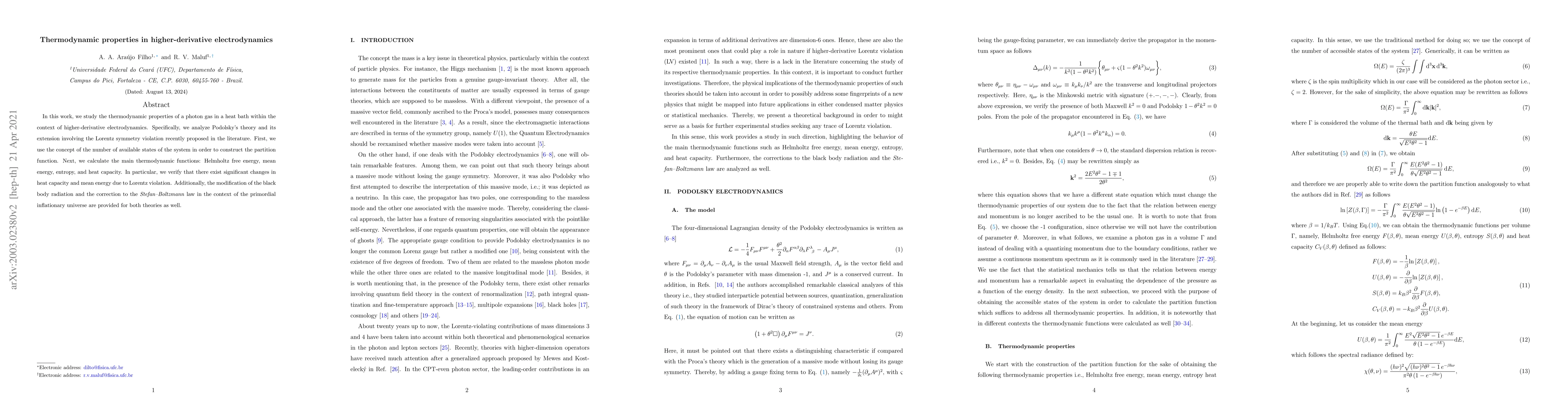 In this work, we study the thermodynamic properties of a photon gas in a heat bath within the context of higher-derivative electrodynamics. Specifically, we analyze Podolsky's theory and its extension involving the Lorentz symmetry violation recently proposed in the literature. First, we use the concept of the number of available states of the system in order to construct the partition function. Next, we calculate the main thermodynamic functions: Helmholtz free energy, mean energy, entropy, and heat capacity. In particular, we verify that there exist significant changes in heat capacity and mean energy due to Lorentz violation. Additionally, the modification of the black body radiation and the correction to the Stefan-Boltzmann law in the context of the primordial inflationary universe are provided for both theories as well.