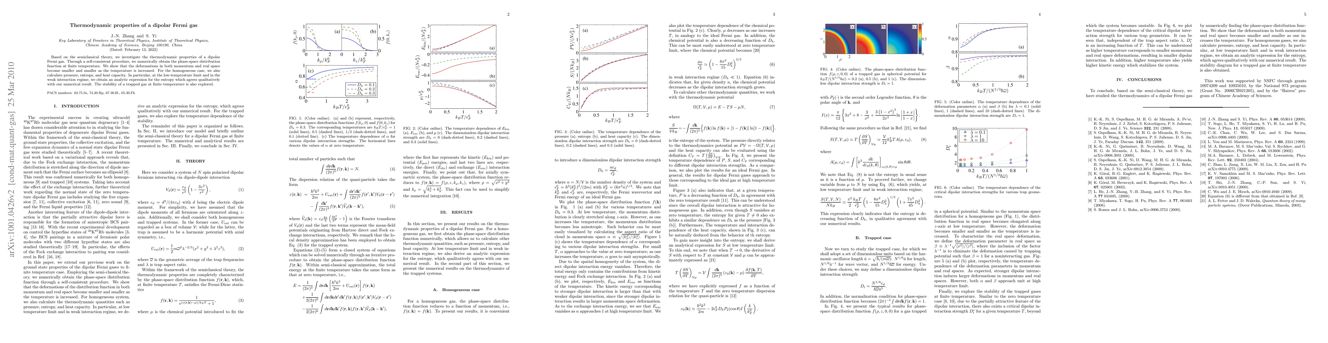 This paper investigates the thermodynamic properties of a dipolar Fermi gas using semi-classical theory, revealing that temperature reduces deformations in momentum and real space. It calculates pressure, entropy, and heat capacity, obtaining an analytic entropy expression in the low-temperature, weak interaction regime that aligns with numerical results, and explores the stability of trapped gas at finite temperatures.