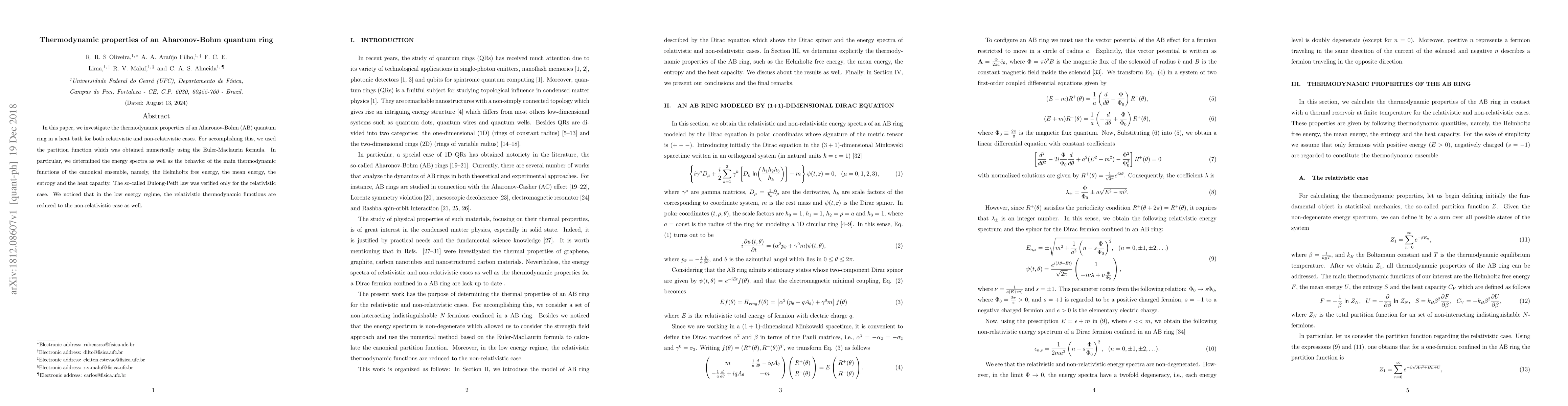In this paper, we investigate the thermodynamic properties of an Aharonov-Bohm (AB) quantum ring in a heat bath for both relativistic and non-relativistic cases. For accomplishing this, we used the partition function which was obtained numerically using the Euler-Maclaurin formula. In particular, we determined the energy spectra as well as the behavior of the main thermodynamic functions of the canonical ensemble, namely, the Helmholtz free energy, the mean energy, the entropy and the heat capacity. The so-called Dulong-Petit law was verified only for the relativistic case. We noticed that in the low energy regime, the relativistic thermodynamic functions are reduced to the non-relativistic case as well.