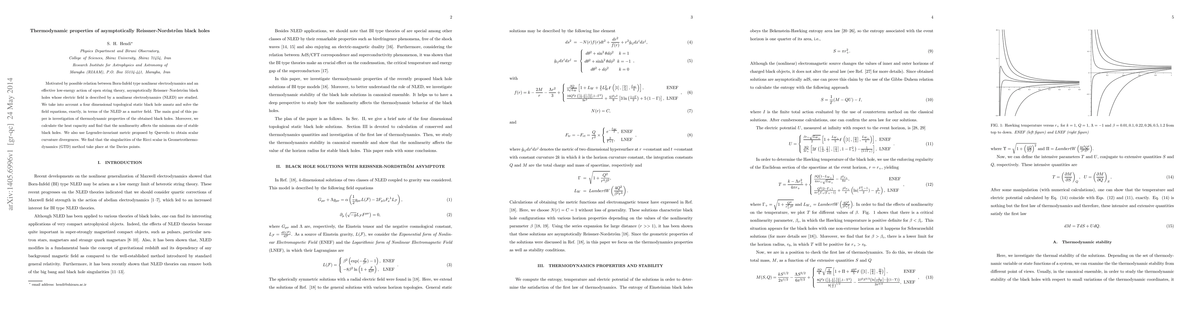 Motivated by possible relation between Born-Infeld type nonlinear electrodynamics and an effective low-energy action of open string theory, asymptotically Reissner--Nordstrom black holes whose electric field is described by a nonlinear electrodynamics (NLED) are studied. We take into account a four dimensional topological static black hole ansatz and solve the field equations, exactly, in terms of the NLED as a matter field. The main goal of this paper is investigation of thermodynamic properties of the obtained black holes. Moreover, we calculate the heat capacity and find that the nonlinearity affects the minimum size of stable black holes. We also use Legendre-invariant metric proposed by Quevedo to obtain scalar curvature divergences. We find that the singularities of the Ricci scalar in Geometrothermodynamics (GTD) method take place at the Davies points.