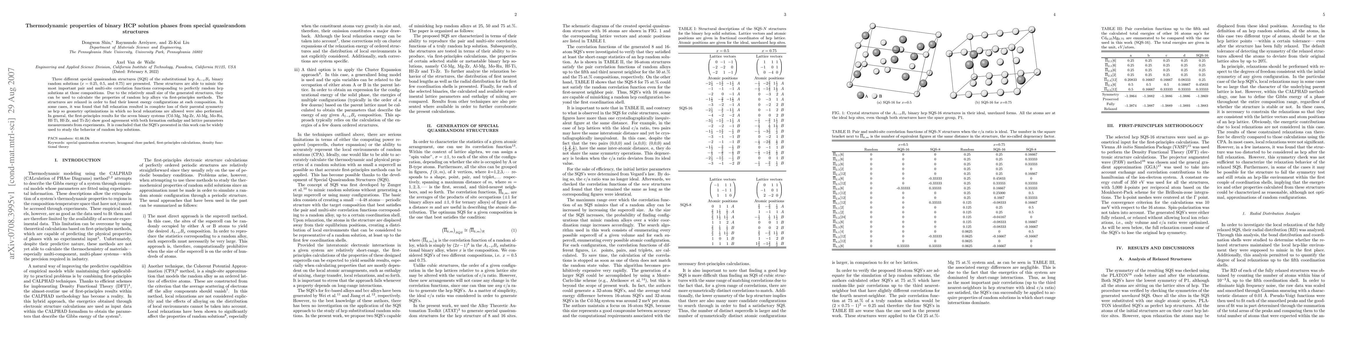 This paper presents special quasirandom structures (SQS) for binary HCP alloy solutions to mimic random hcp alloys, enabling first-principles calculations of thermodynamic properties. The SQS structures show good agreement with experimental measurements for various binary systems, indicating their utility for studying random HCP solutions.