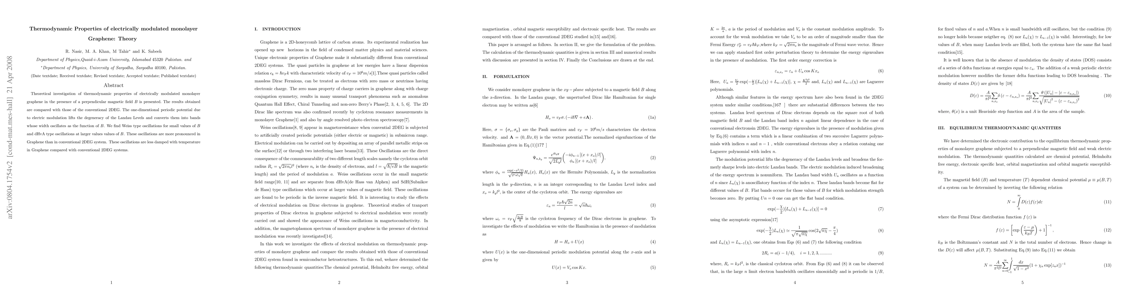 This research investigates how electric modulation affects the thermodynamic properties of monolayer graphene under a perpendicular magnetic field, revealing enhanced Weiss and dHvA oscillations compared to conventional 2DEG systems, with modulation-induced effects being more pronounced and less temperature-dependent in graphene.