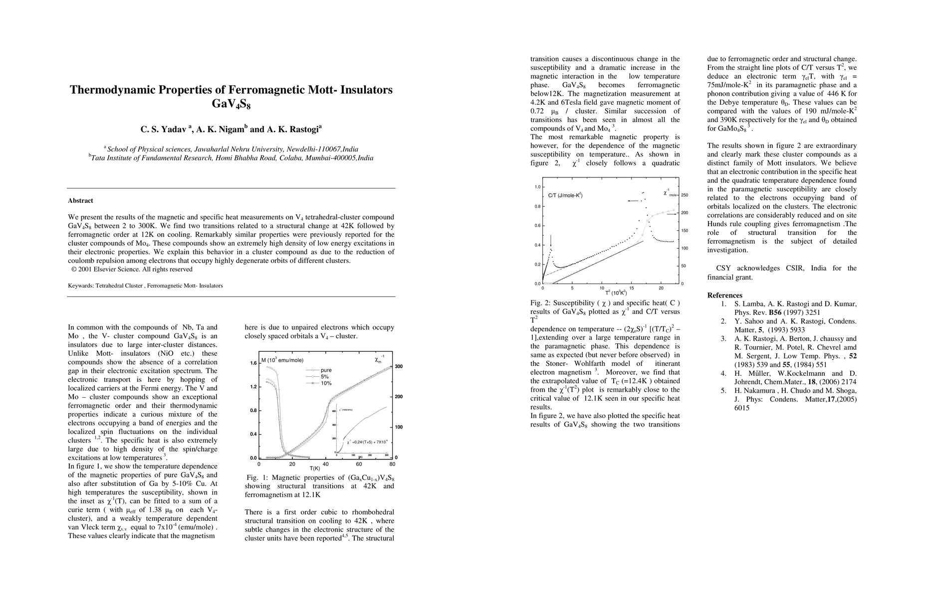 We present the results of the magnetic and specific heat measurements on V4 tetrahedral-cluster compound GaV4S8 between 2 to 300K. We find two transitions related to a structural change at 42K followed by ferromagnetic order at 12K on cooling. Remarkably similar properties were previously reported for the cluster compounds of Mo4. These compounds show an extremely high density of low energy excitations in their electronic properties. We explain this behavior in a cluster compound as due to the reduction of coulomb repulsion among electrons that occupy highly degenerate orbits of different clusters.