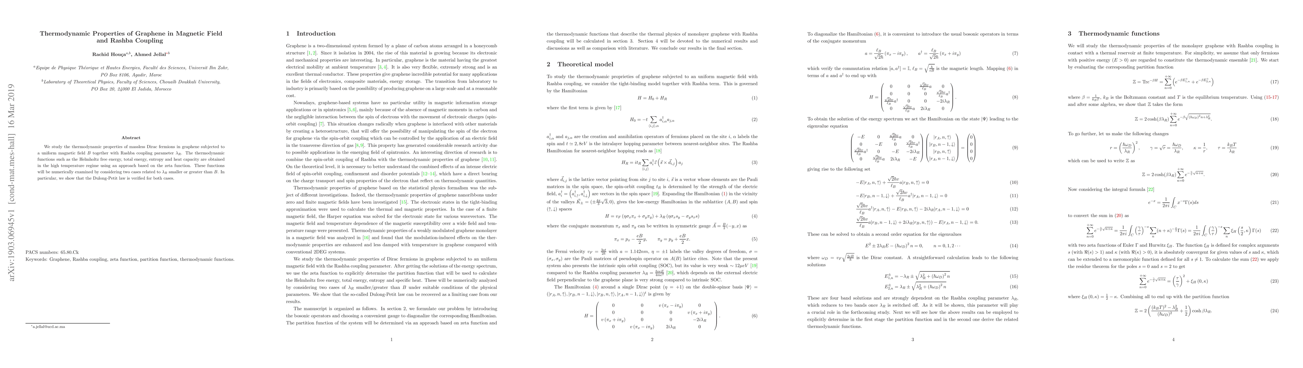 Researchers studied thermodynamic properties of graphene in a magnetic field and Rashba coupling, finding that both cases verify the Dulong-Petit law at high temperatures.