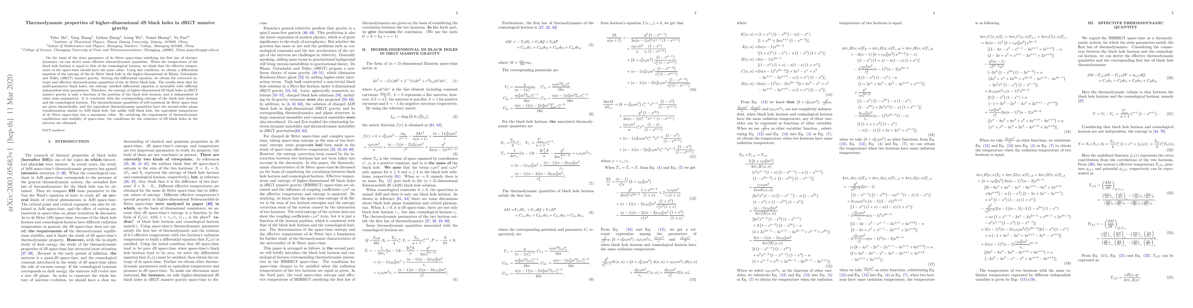 On the basis of the state parameter of de Sitter space-time satisfying the first law of thermodynamics,we can derive some effective thermodynamic quantities.When the temperature of the black hole horizon is equal to that of the cosmological horizon, we think that the effective temperature of the space-time should have the same value. Using this condition, we obtain a differential equation of the entropy of the de Sitter black hole in the higherdimensional de Rham, Gabadadze and Tolley (dRGT) massive gravity. Solving the differential equation, we obtain the corrected entropy and effective thermodynamic quantities of the de Sitter black hole. The results show that for multiparameter black holes, the entropy satisfied differential equation is invariable with different independent state parameters. Therefore, the entropy of higher-dimensional dS black holes in dRGT massive gravity is only a function of the position of the black hole horizon, and is independent of other state parameters. It is consistent with the corresponding entropy of the black hole horizon and the cosmological horizon. The thermodynamic quantities of self-consistent de Sitter spacetime are given theoretically, and the equivalent thermodynamic quantities have the second-order phase transformation similar to AdS black hole, but unlike AdS black hole, the equivalent temperature of de Sitter space-time has a maximum value. By satisfying the requirement of thermodynamic equilibrium and stability of space-time, the conditions for the existence of dS black holes in the universe are obtained.