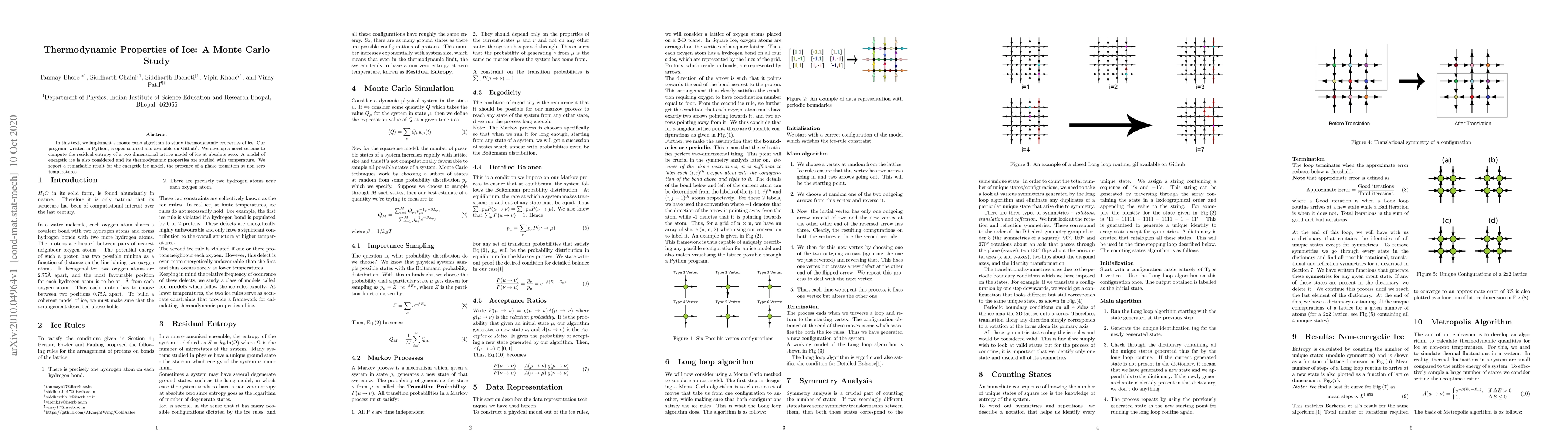 This paper uses a Monte Carlo algorithm to study the thermodynamic properties of ice, focusing on a two-dimensional lattice model to compute residual entropy at absolute zero. The study also investigates an energetic ice model, revealing a phase transition at non-zero temperatures.
